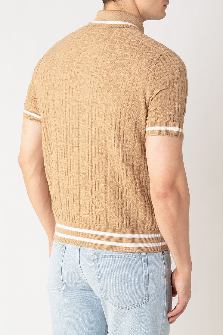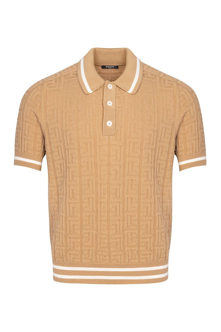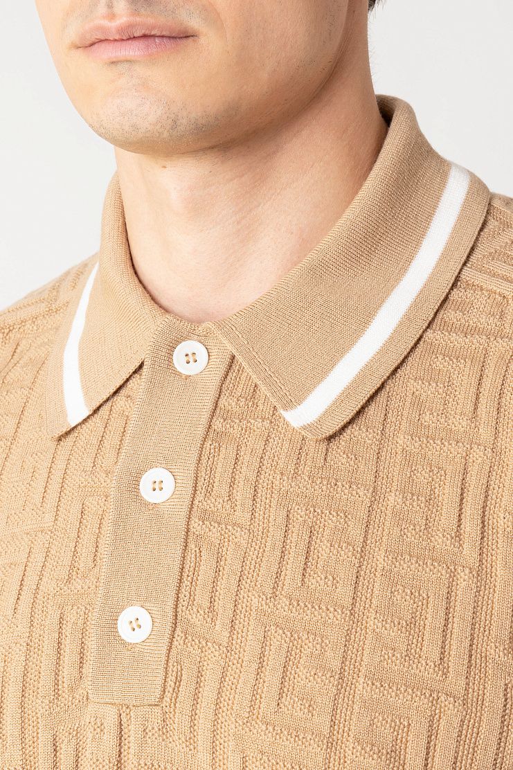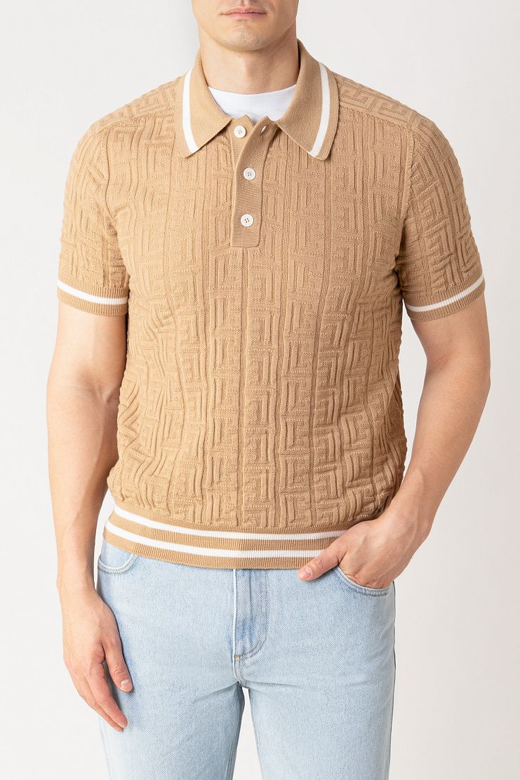 Поло выполнено из трикотажа с фактурным фирменным узором на основе тонкой шерсти. Модель дополнена отложным воротником, короткими рукавами и планкой на пуговицах. Контрастная полосатая отделка придает модели яркий штрих. Такое лаконичное поло будет отлично сочетается с джинсами, брюками чинос и шортами.