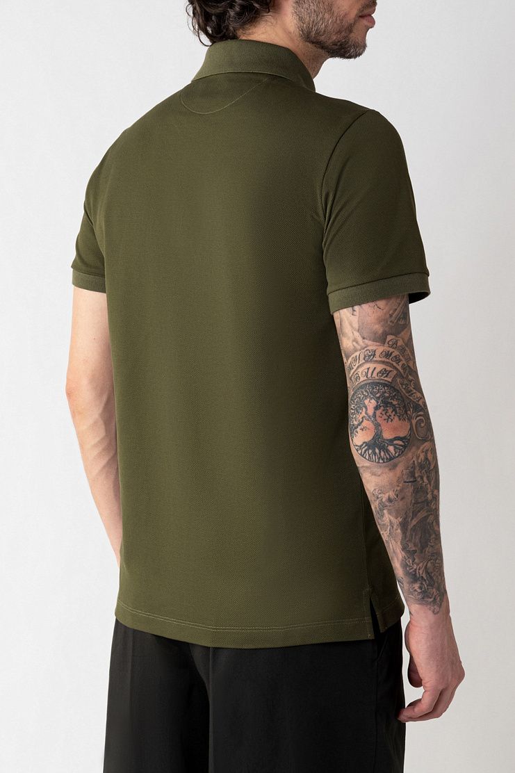 Поло сшили из хлопкового пике, изготовленного из отборного хлопка. Волокна эластана в составе делают ткань прочнее и не дают ей растягиваться. Модель дополнена планкой на кнопках, небольшими разрезами по бокам, а также ребристой отделкой на воротнике и манжетах. Изделие украсили тисненым логотипом на груди и брендированной нашивкой сбоку.