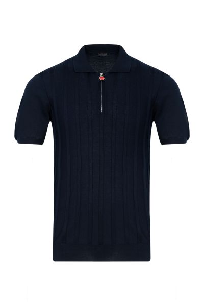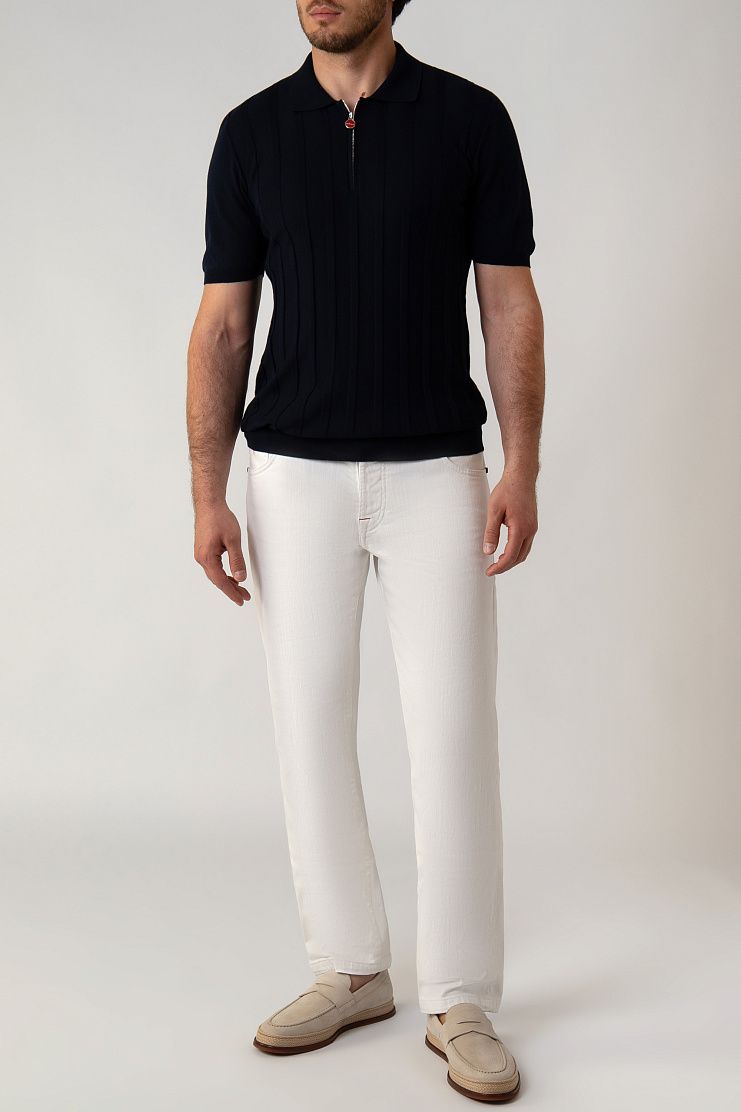 Поло с рельефным полосатым узором выполнили из дышащего и приятного на ощупь хлопкового трикотажа. Изделие с отделкой в рубчик на манжетах и поясе застегивается на короткую молнию с круглым брендированным пуллером. Такая лаконичная модель прекрасно дополнит базовый летний гардероб.
