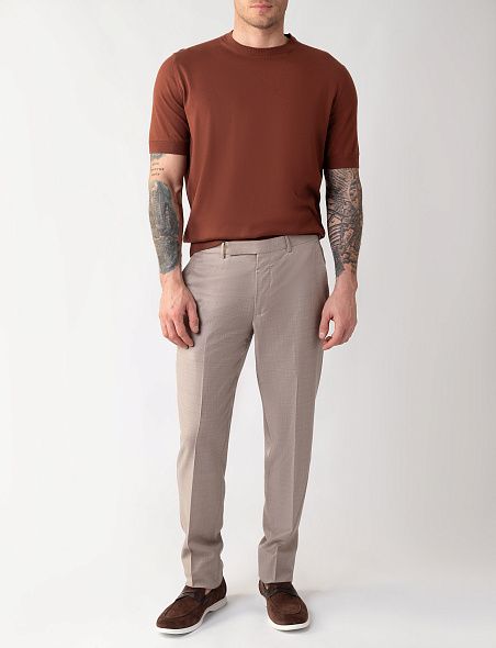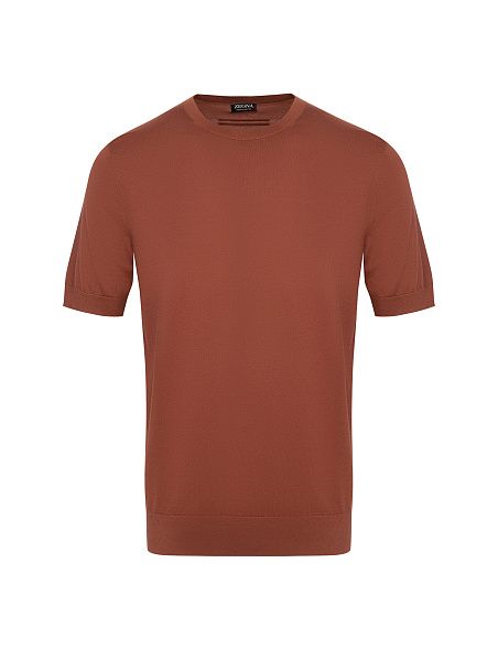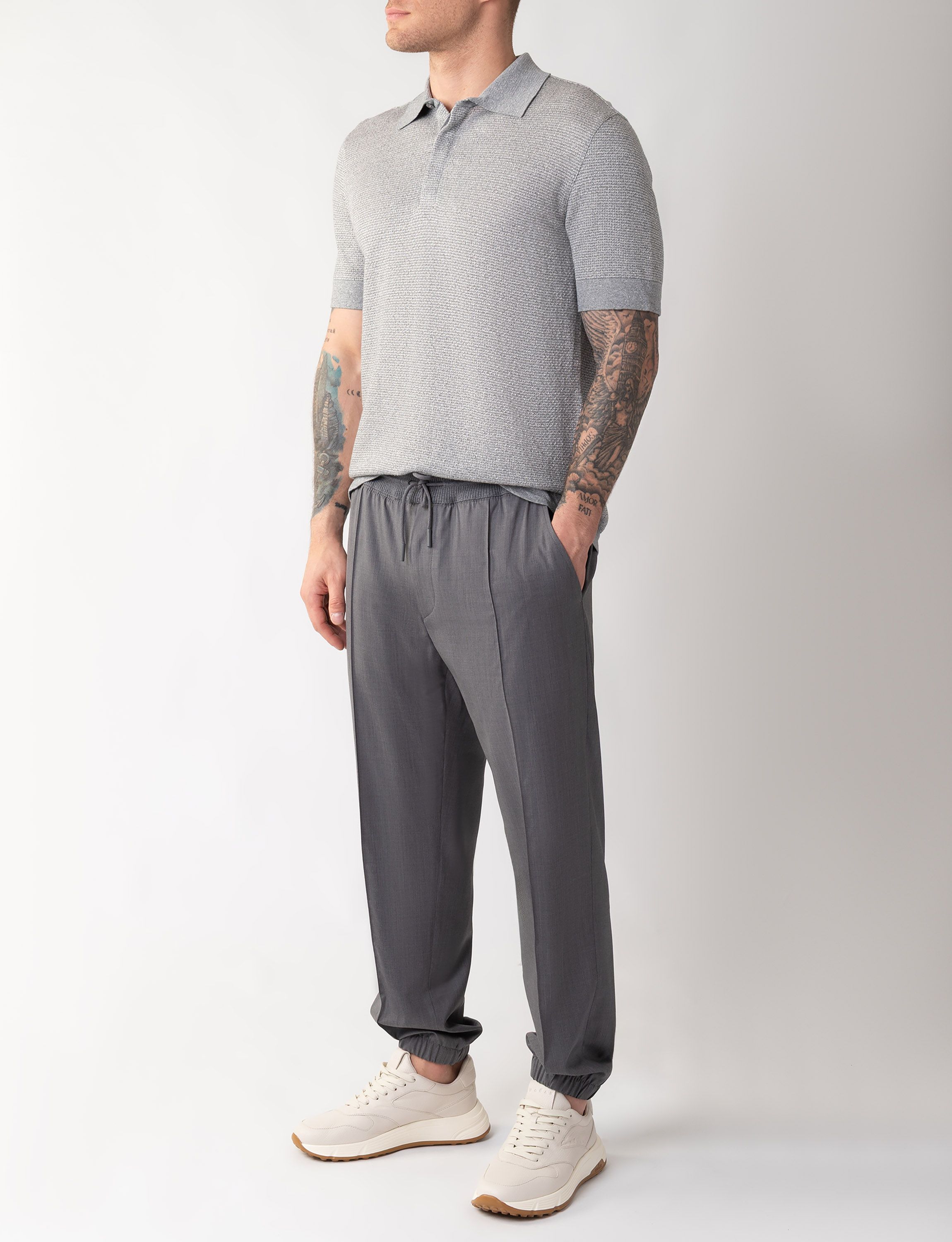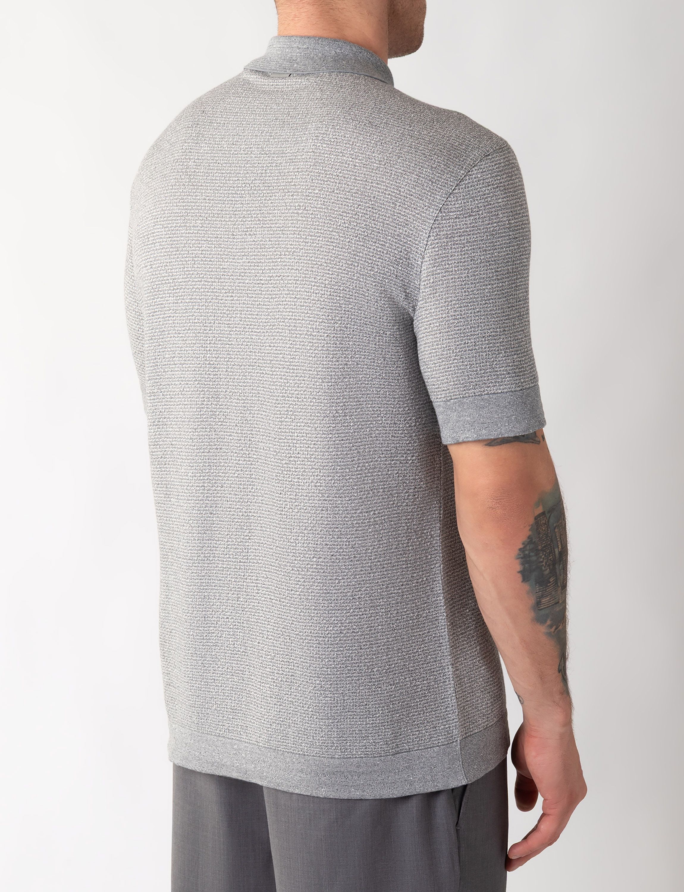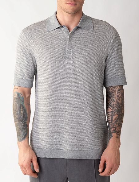 Поло с эластичной отделкой на манжетах и поясе выполнили из мягкого трикотажа на основе шелка и хлопка. Модель дополнена планкой, которая застегивается на перламутровые пуговицы.