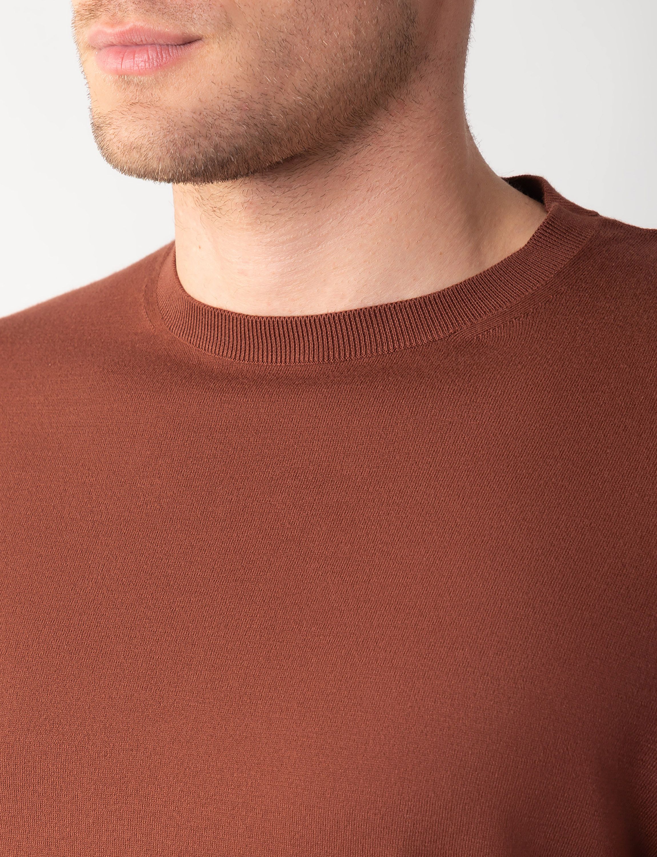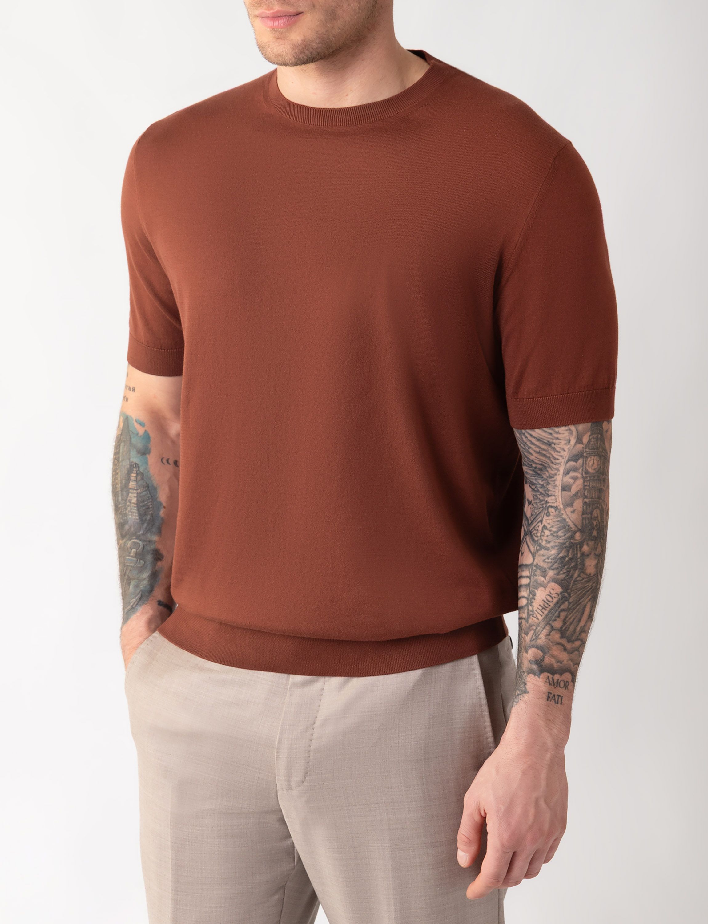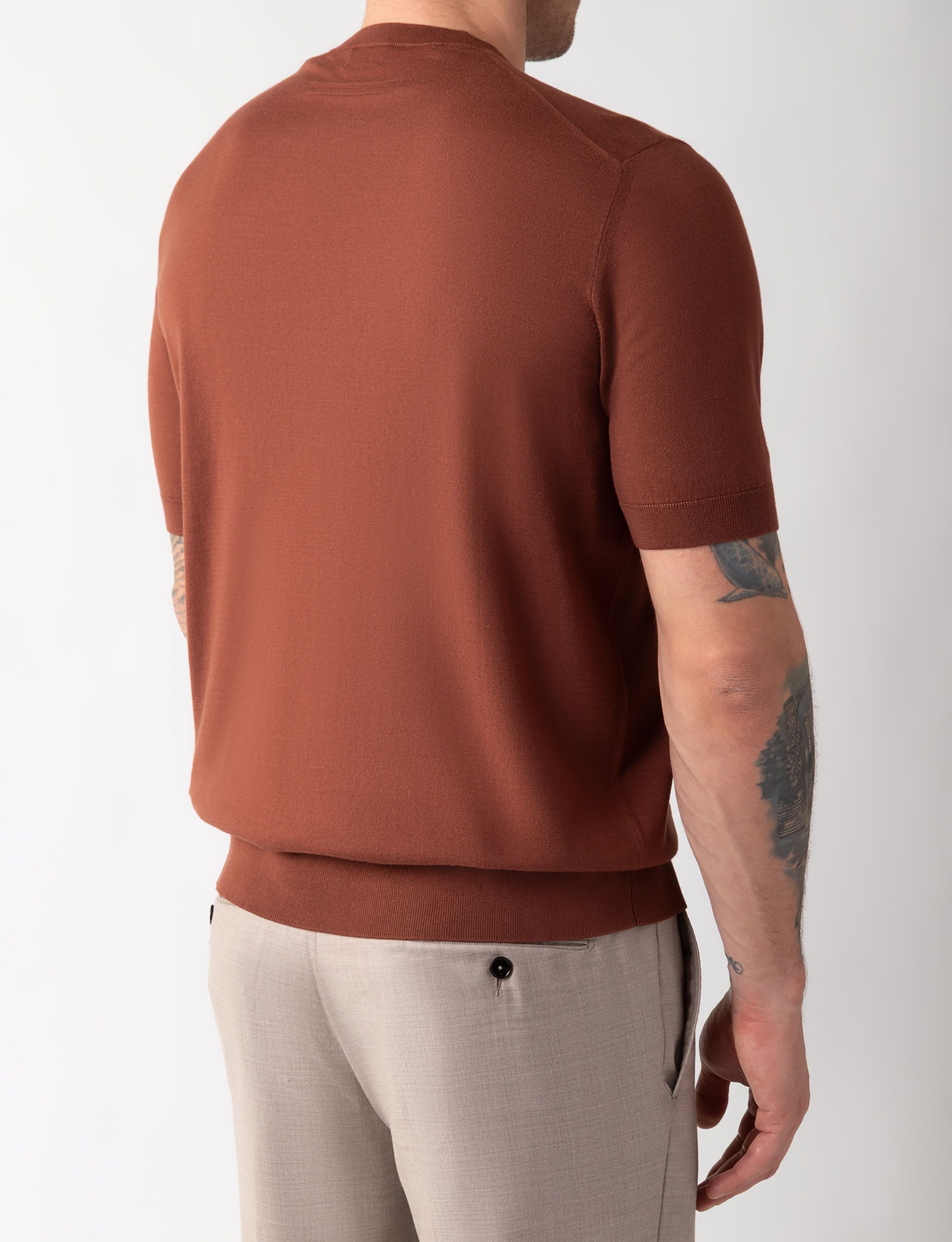 Поло с эластичной отделкой на манжетах и поясе выполнили из мягкого трикотажа на основе шелка и хлопка. Модель дополнена планкой, которая застегивается на перламутровые пуговицы.