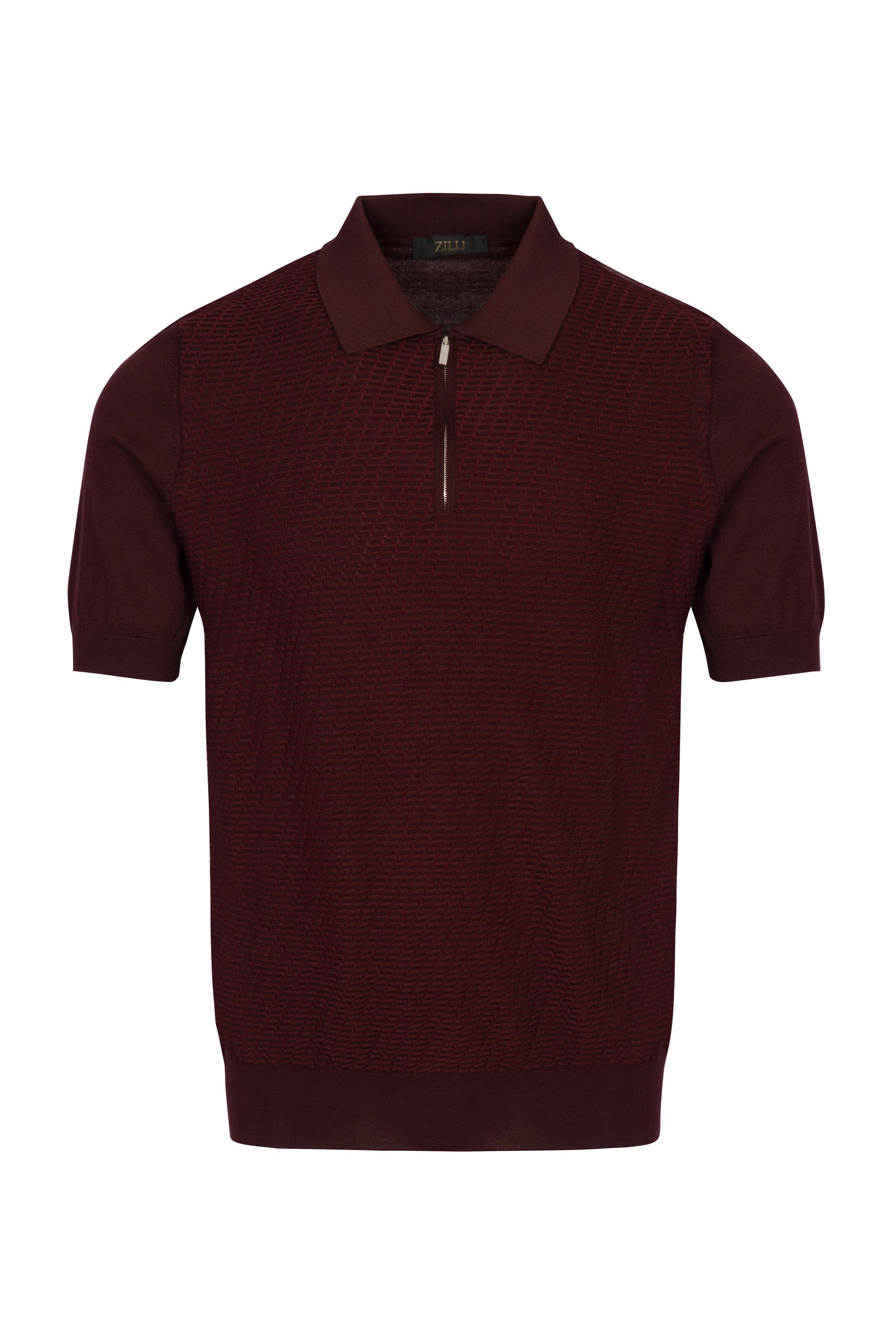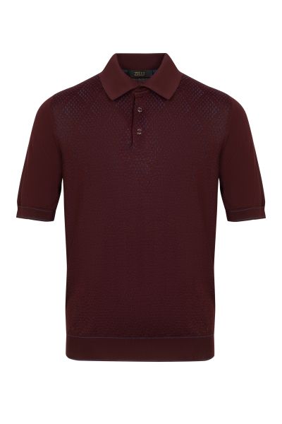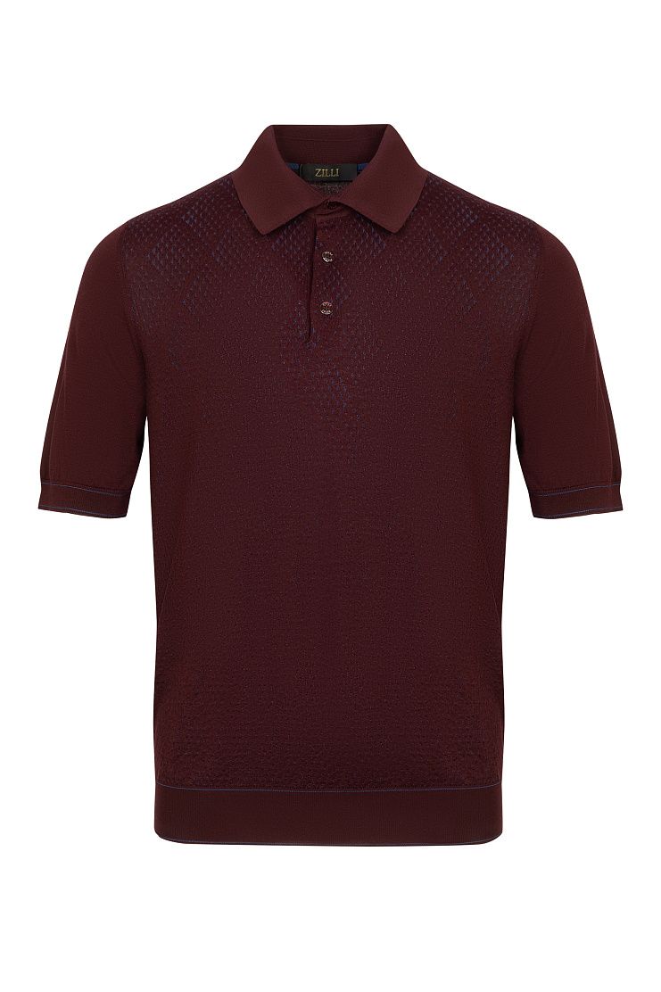 Рубашку-поло с короткими рукавами выполнили из тонкого трикотажа на основе шелка и хлопка. Модель с геометрическим вязаным узором дополнена отделкой в рубчик на манжетах и поясе. Изделие с отложным воротником застегивается на пуговицы.