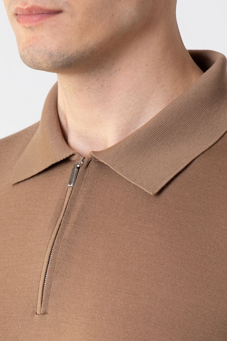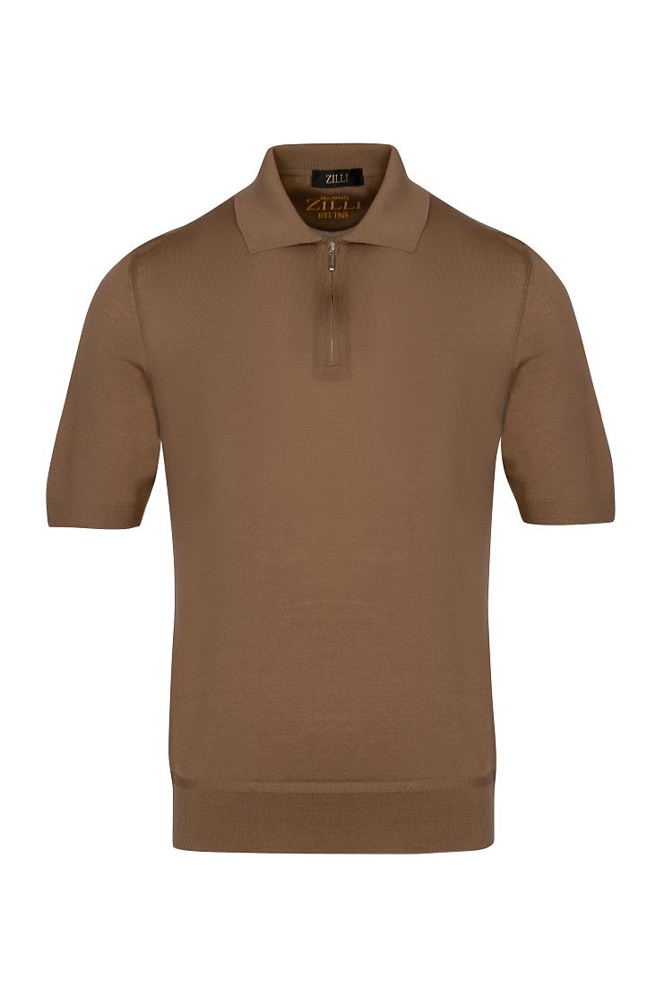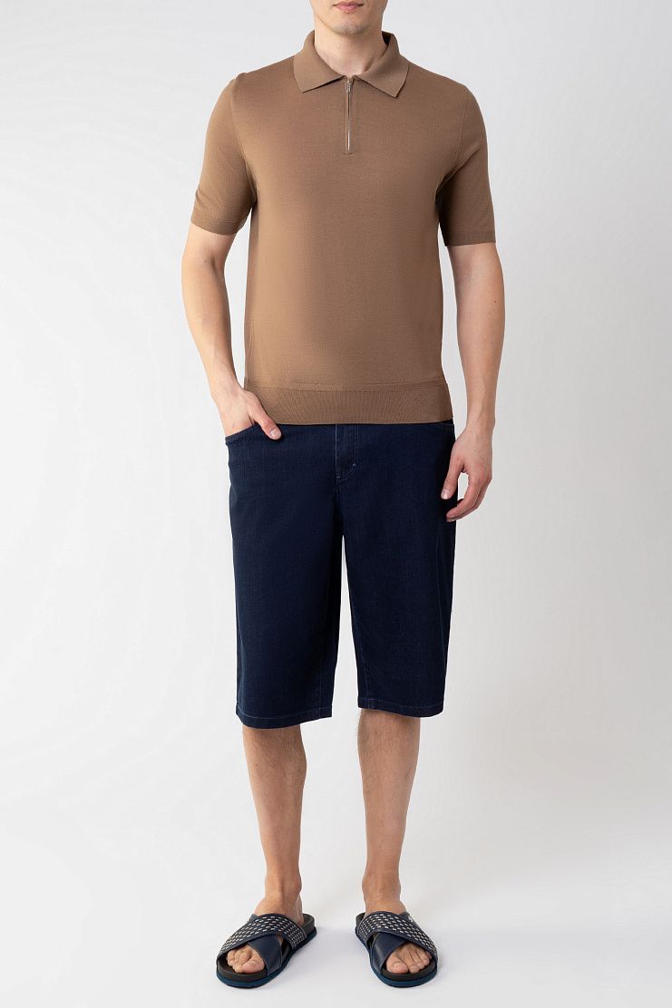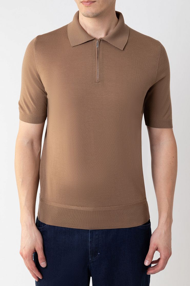 Поло с короткими рукавами выполнили из гладкого шерстяного трикотажа. Модель с отделкой в рубчик на манжетах и поясе застегивается на короткую молнию. Универсальный вариант, который органично дополнит повседневный образ с брюками или джинсами.