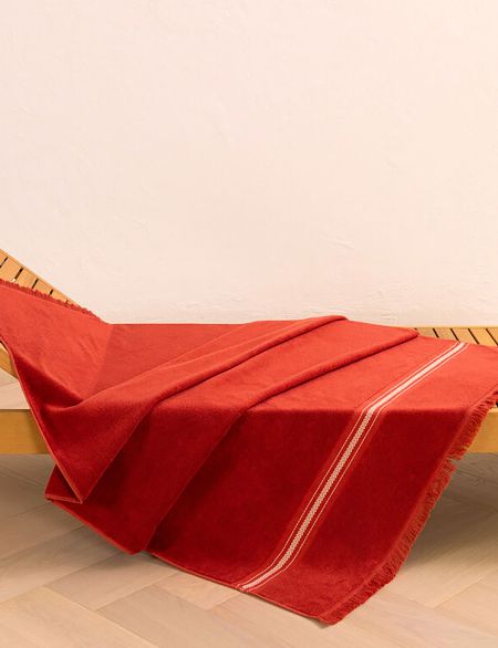 Пляжное полотенце Oasis выполнено из мягкого махрового хлопка, который отлично впитывает влагу и быстро высыхает. Аксессуар украшен короткой бахромой по краям и текстильной отделкой с геометрическим узором добби.