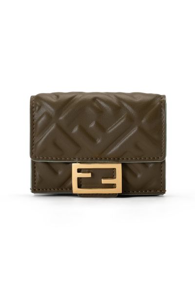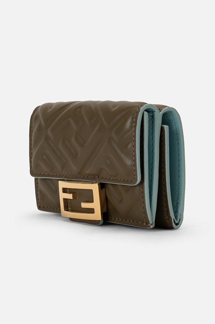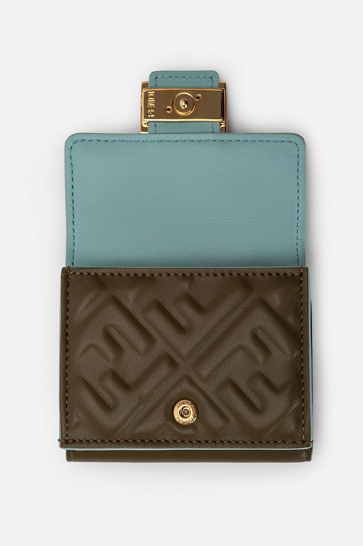 Для пошива этого портмоне выбрали гладкую блестящую наппу с объемным тиснением в виде литеры «F». Внутри модель дополнили контрастной отделкой, слотами для карт и отделениями для купюр и монет. Аксессуар украшен пряжкой с монограммой FF и застегивается на кнопку.