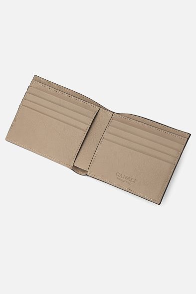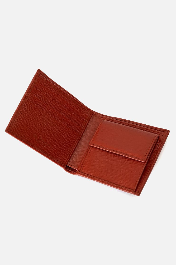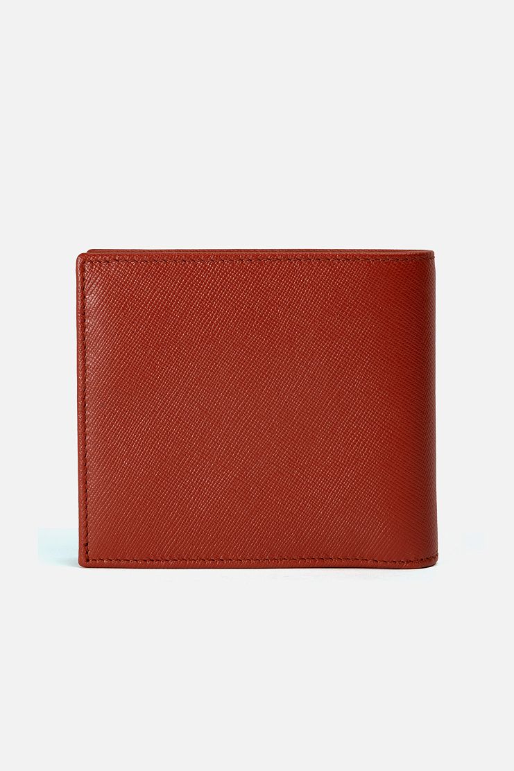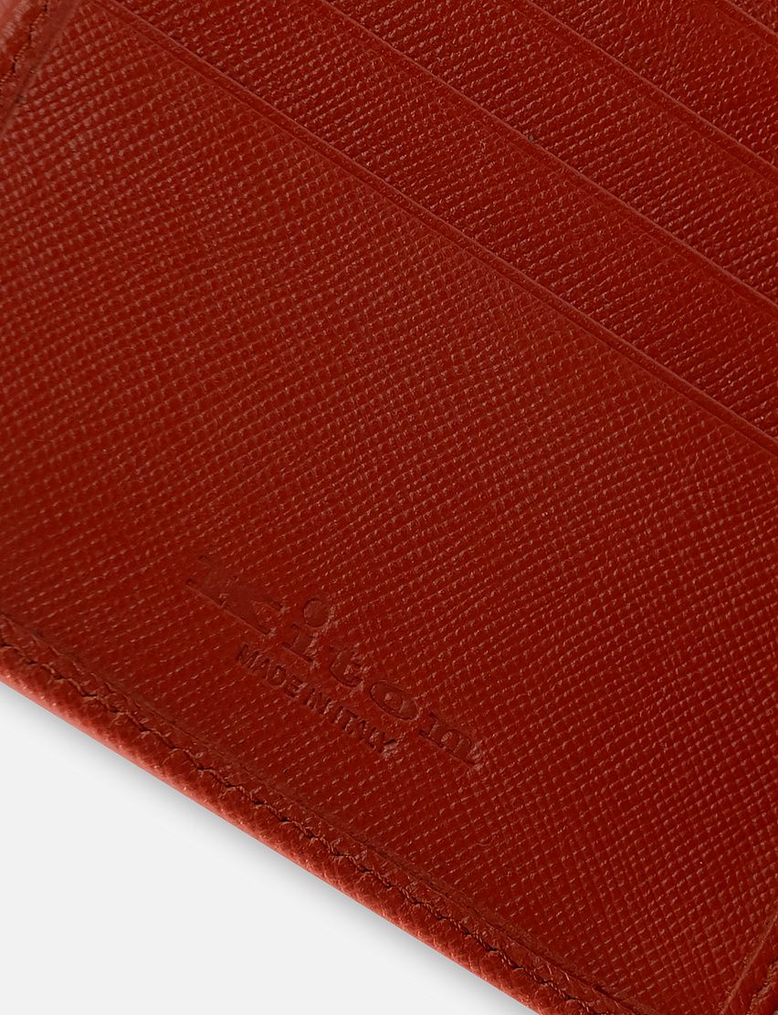 Компактное портмоне изготовили из прочной тисненой кожи. Модель с четырьмя слотами для кредитных карт и отделениями для купюр и монет украсили логотипом марки снаружи и внутри.