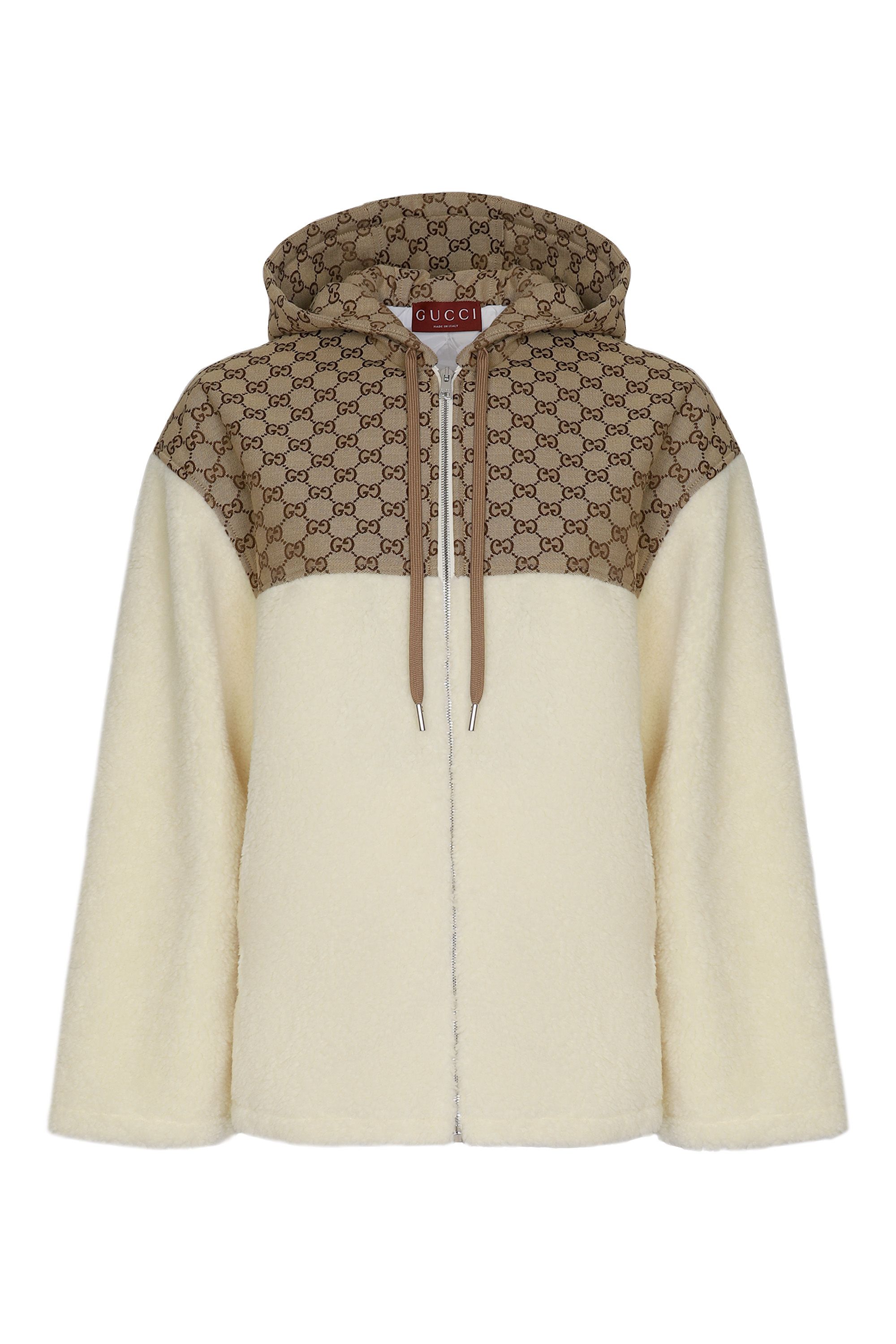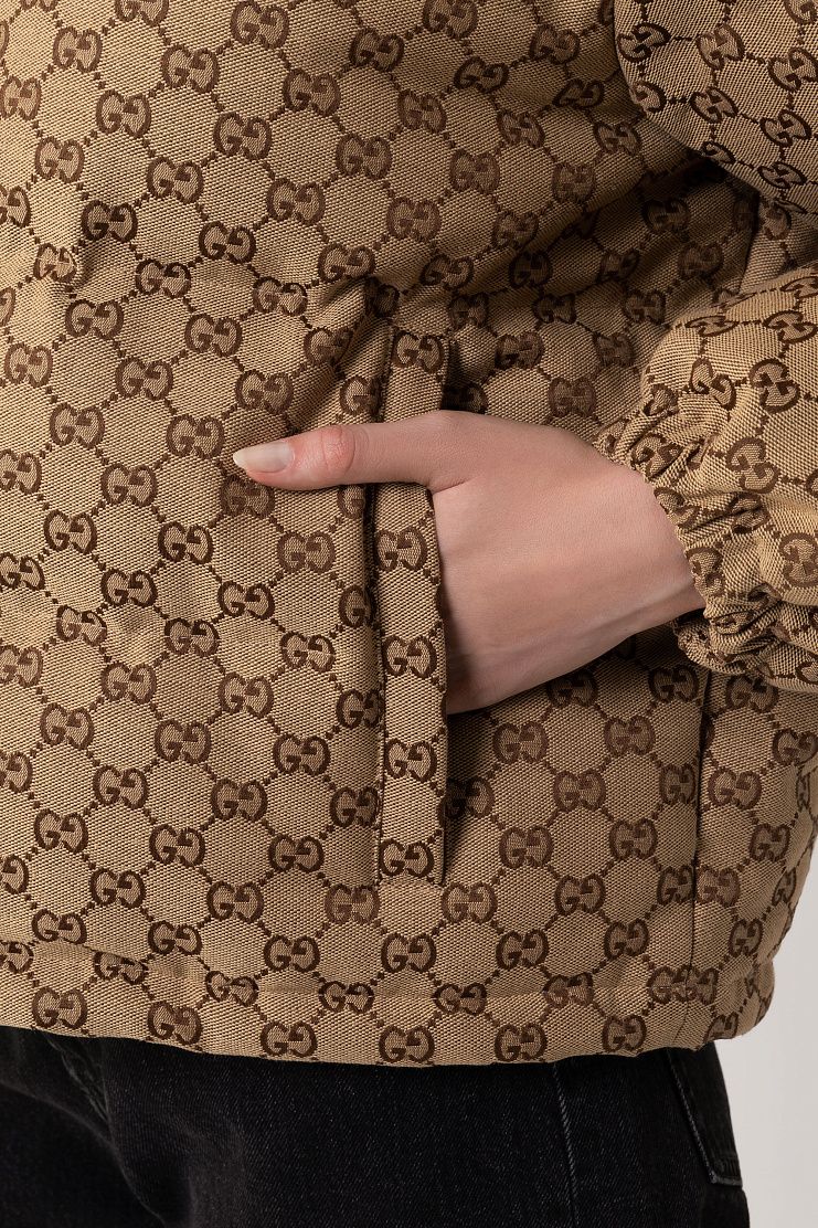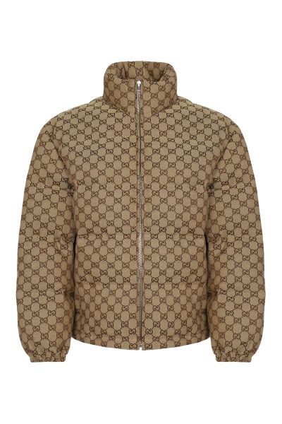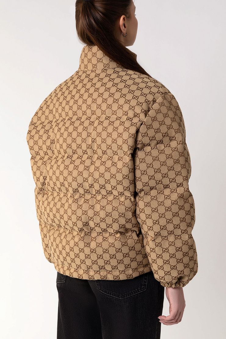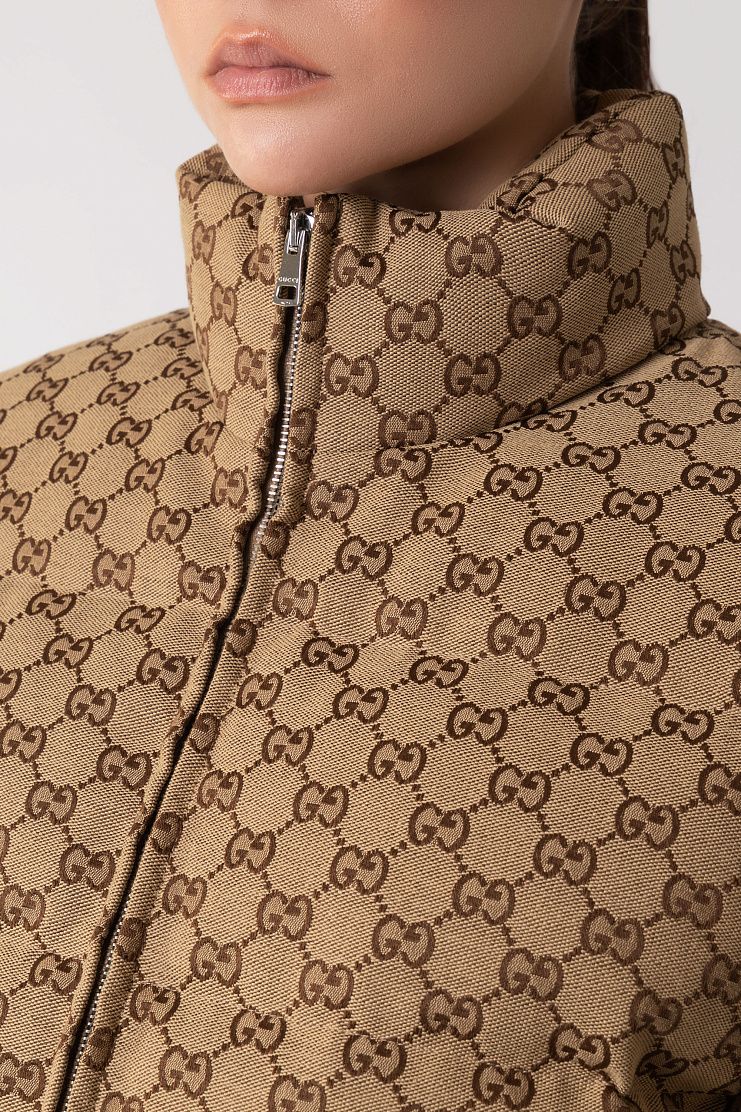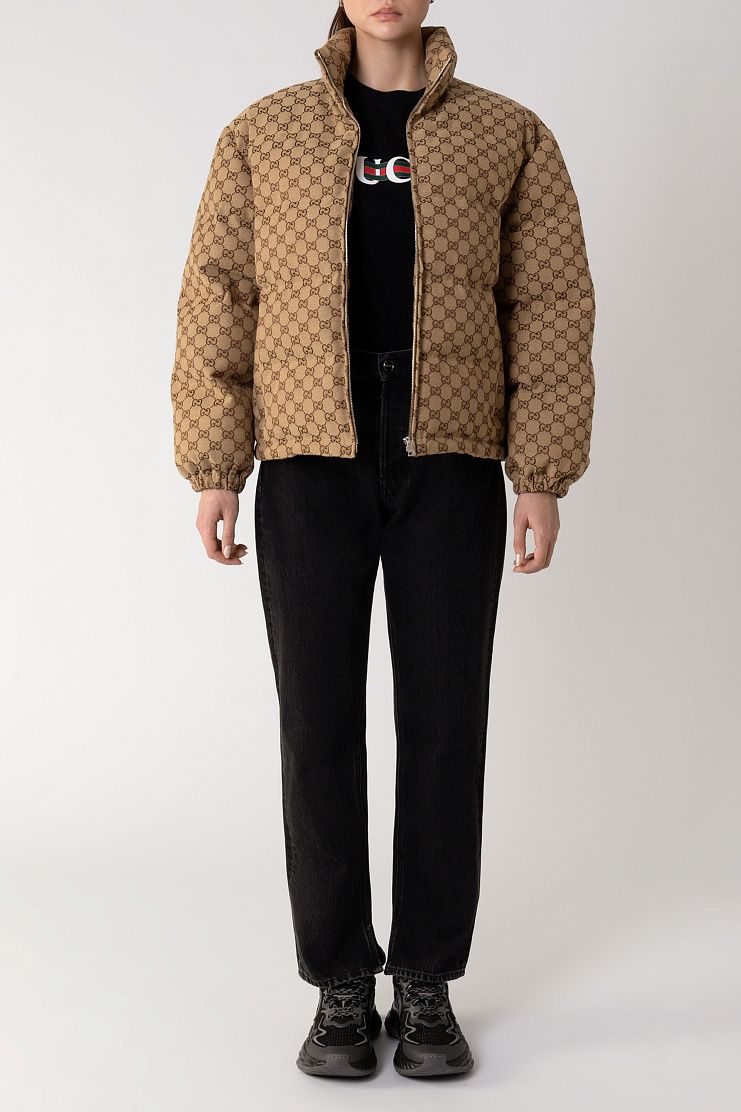 Объемная куртка из плотного хлопкового текстиля с легким пуховым наполнителем отлично согреет в холодную погоду. Модель дополнена воротником-стойкой, карманами, а также длинными рукавами со спущенной линией плеч и эластичными манжетами. В комплект входит тонкий ремешок с металлической пряжкой Double G, формирующий приталенный силуэт. Яркий элемент дизайна — сплошной жаккардовый принт с фирменной монограммой GG.