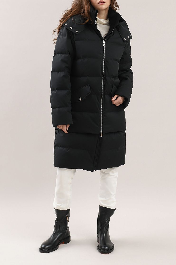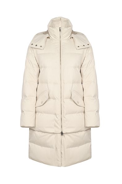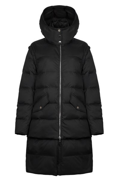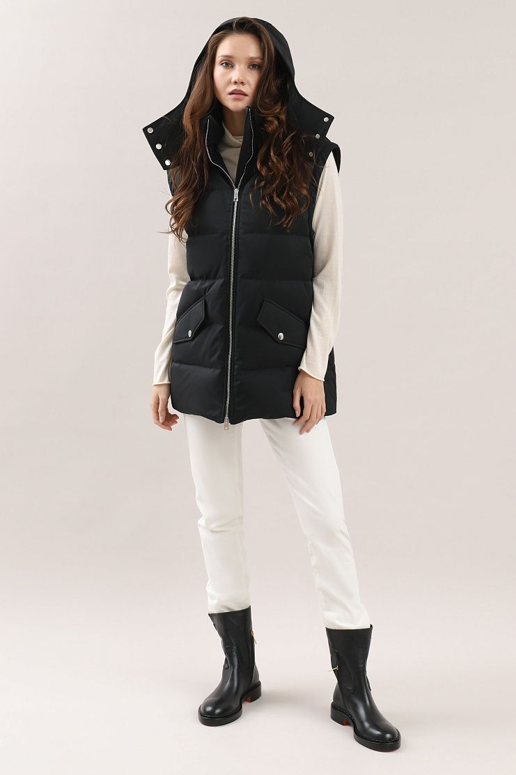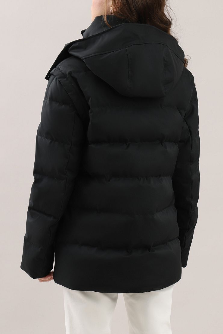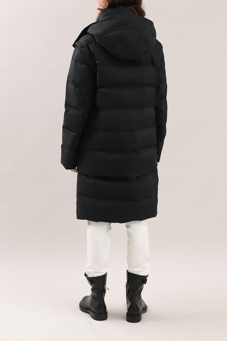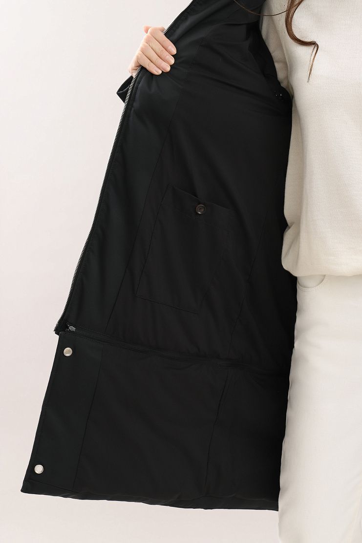 Удлиненная куртка с возможностью трансформации в более короткую модель или жилет прекрасно подойдет для холодной и ветренной погоды. Изделие свободного кроя имеет воротник-стойку, съемный капюшон на кнопках, боковые карманы и застежку на молнию.