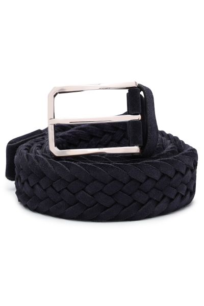 Плетеный замшевый ремень с серебристой прямоугольной пряжкой. Аксессуар регулируется по длине.