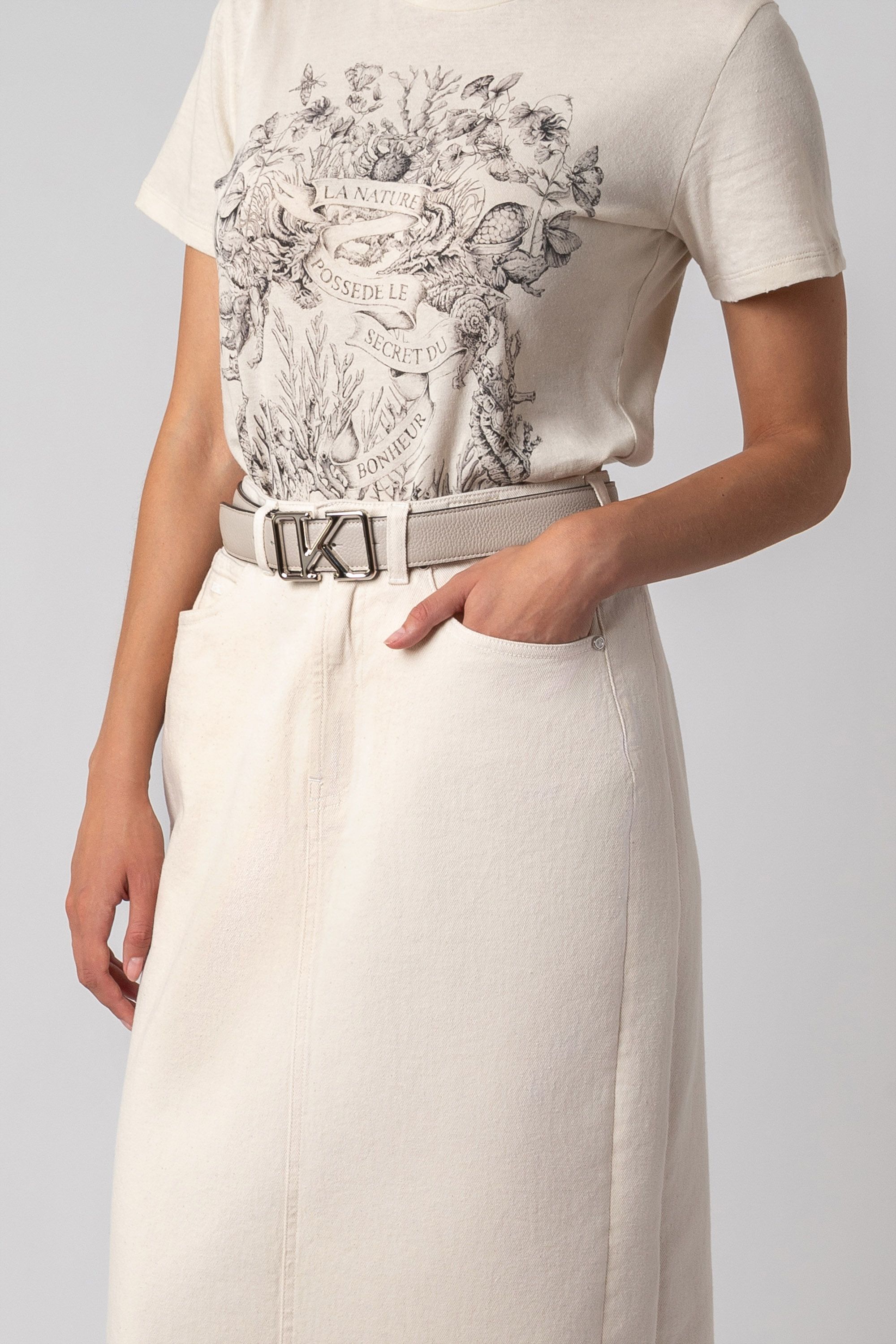 Узкий, регулируемый по длине ремень выполнен из гладкой и пластичной телячьей кожи. Привлекающий внимание элемент декора — крупная золотистая пряжка-логотип 4G.