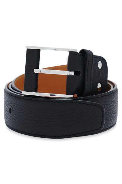 Ремень из зернистой кожи выполнен в лаконичном стиле. Модель с серебристой прямоугольной пряжкой и строчкой по бокам.