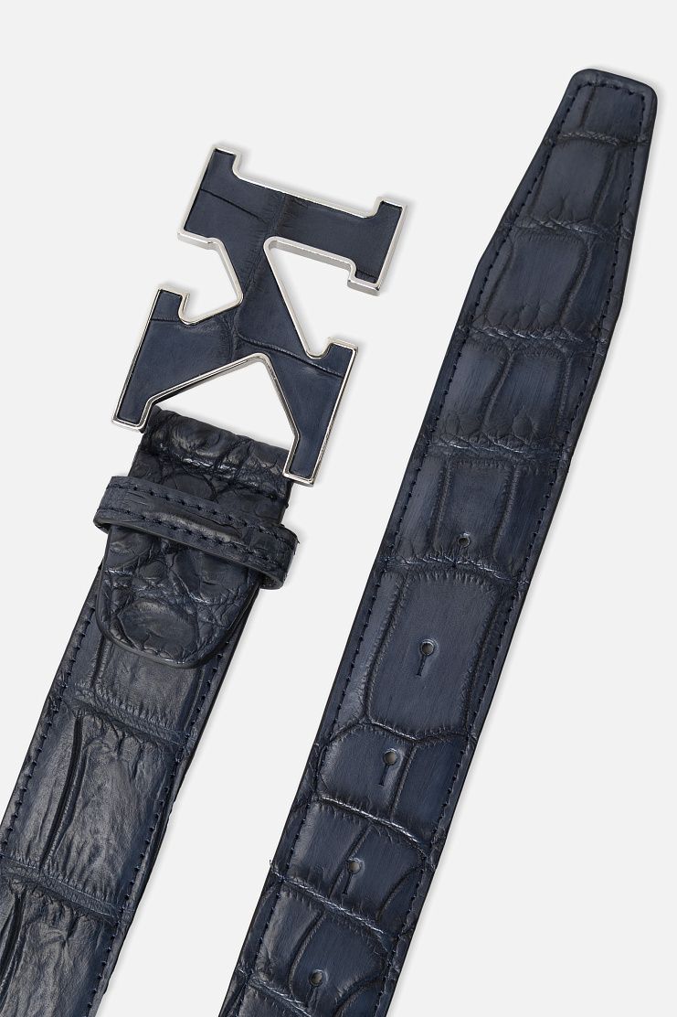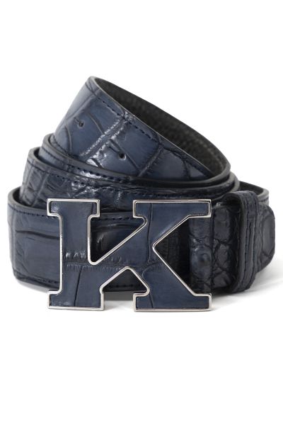 Ремень с фигурной пряжкой в виде литеры К изготовили из мягкой и прочной крокодиловой кожи. Чтобы подчеркнуть уникальный природный рисунок материала, его отполировали до глянцевого блеска. Аксессуар гармонично дополнит повседневные образы.