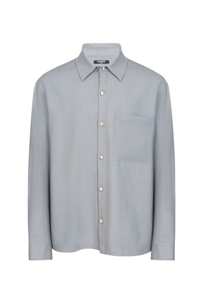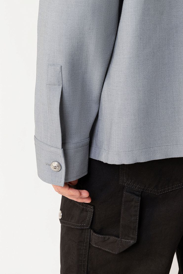 Рубашка свободного кроя выполнена из ткани на основе вискозы и шерсти. В состав также включен эластан, благодаря чему изделие меньше мнется. Модель дополнена отложным воротником, накладным карманом, а также рукавами со спущенной линией плеч и манжетами. Единственный элемент декора — фирменные пуговицы с головой льва.