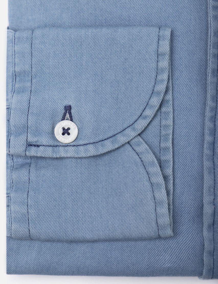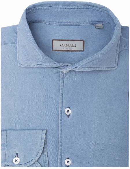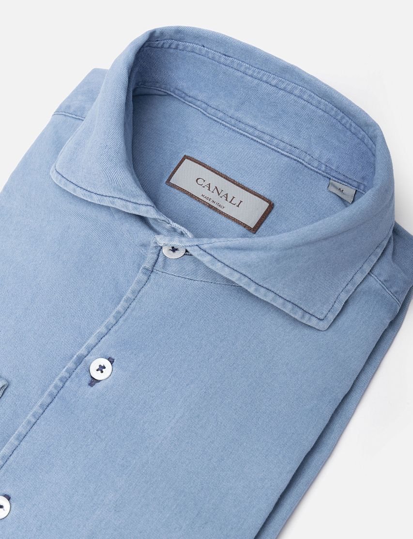 Хлопковая рубашка в полоску светло-голубого цвета. Модель свободного силуэта с отложным воротником. Изделие выполнено с застёжкой на пуговицы по всей длине.