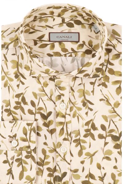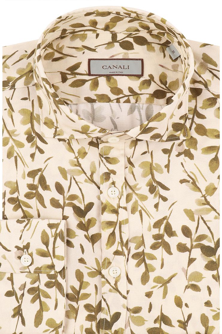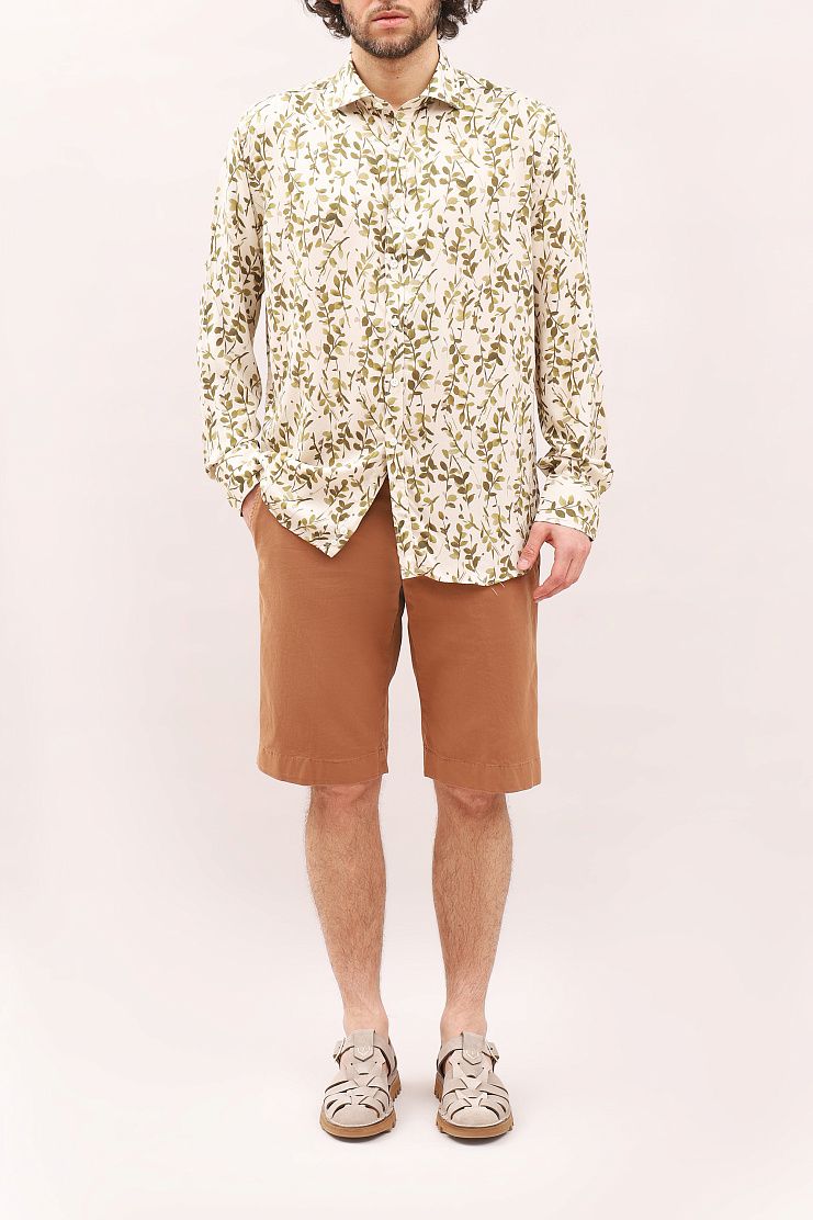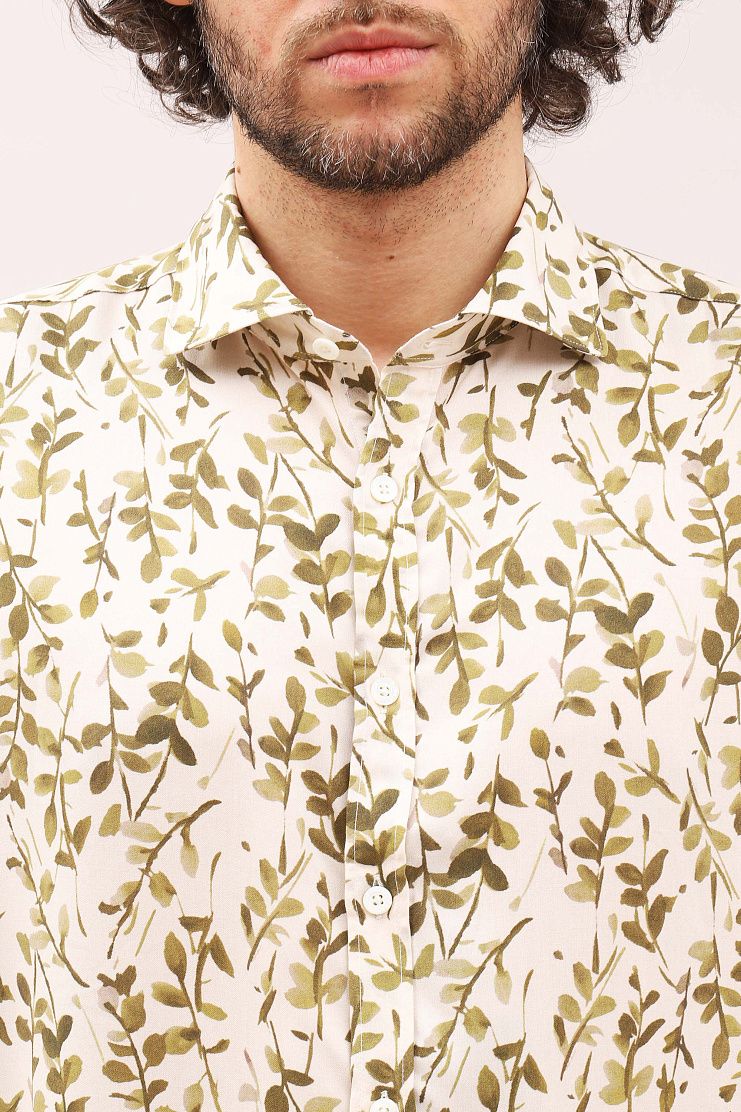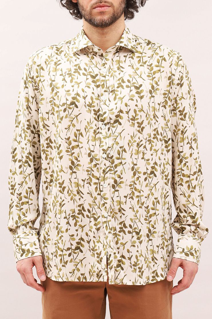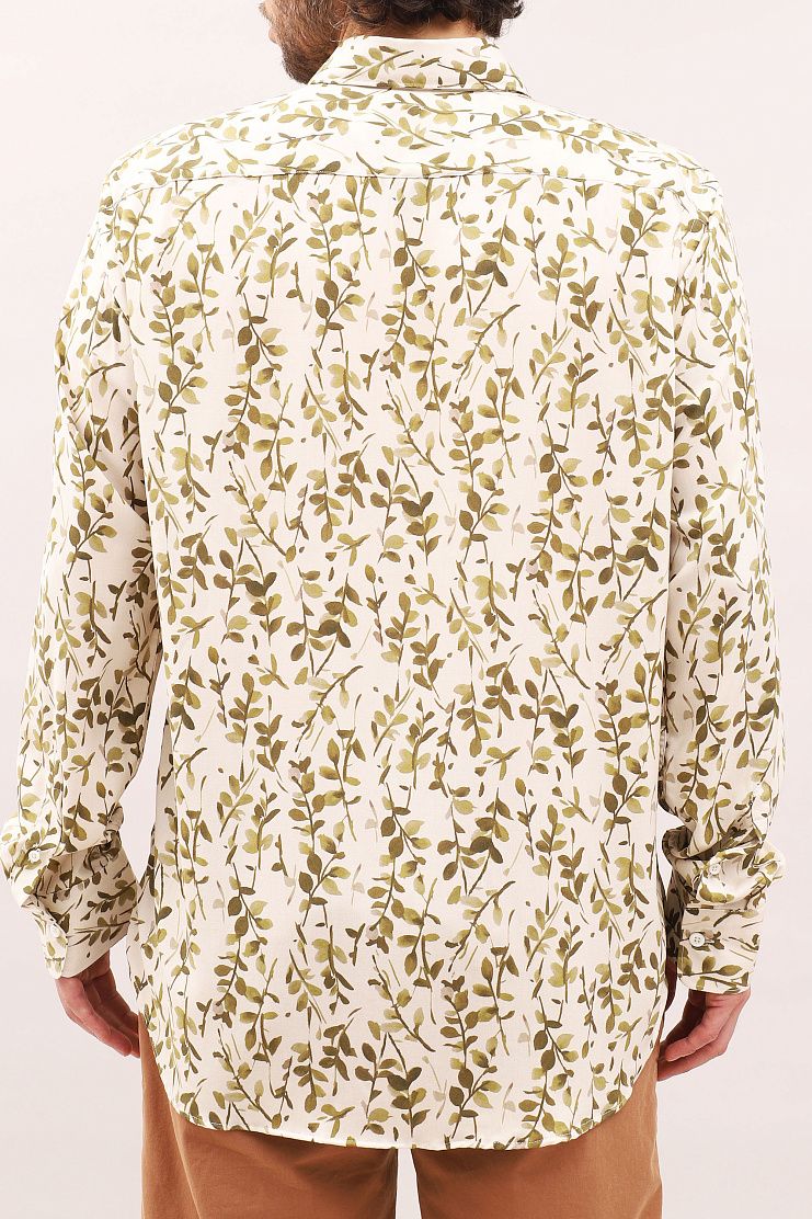 Рубашка с принтом в виде листьев отлично подойдет для повседневного образа. Модель свободного кроя имеет отложной воротник и застежку на пуговицы.