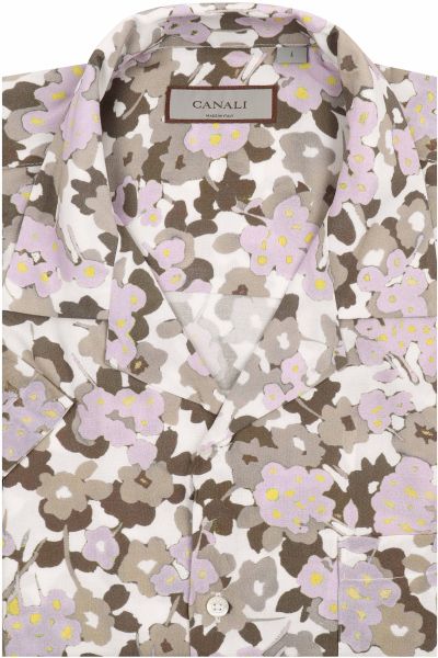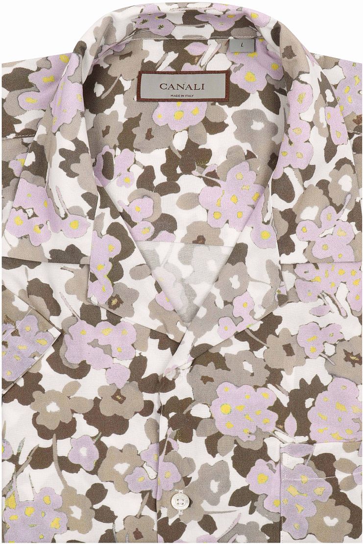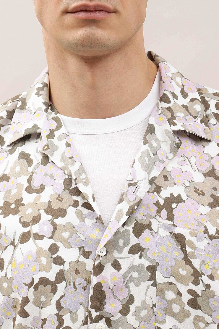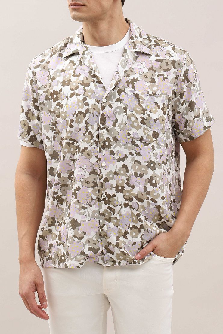 Рубашка с принтом в цветочек в сочетании с однотонной футболкой позволит создать стильный летний образ на каждый день. Модель свободного кроя имеет короткие рукава, отложной воротник, нагрудный накладной карман и застежку на пуговицы.
