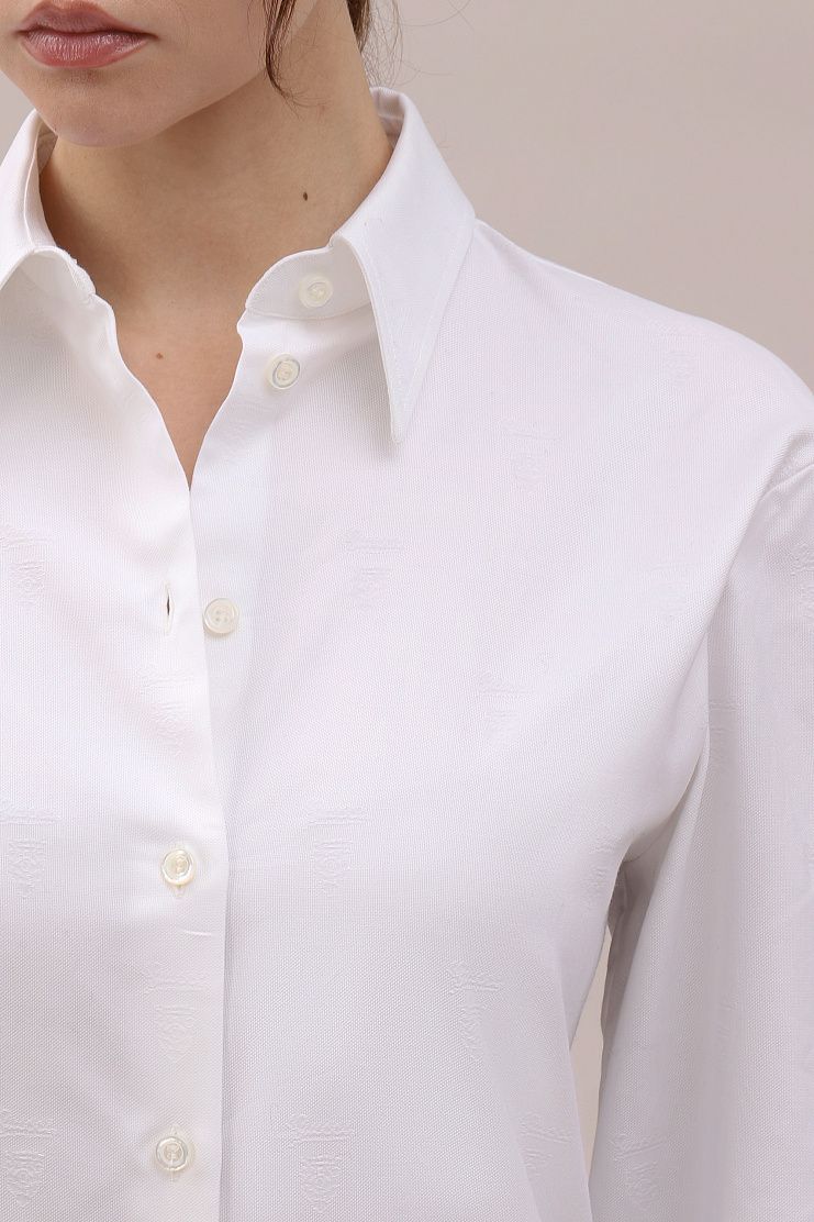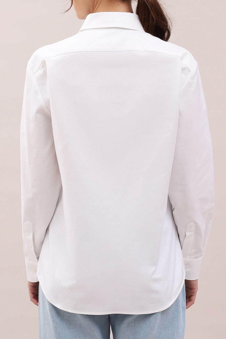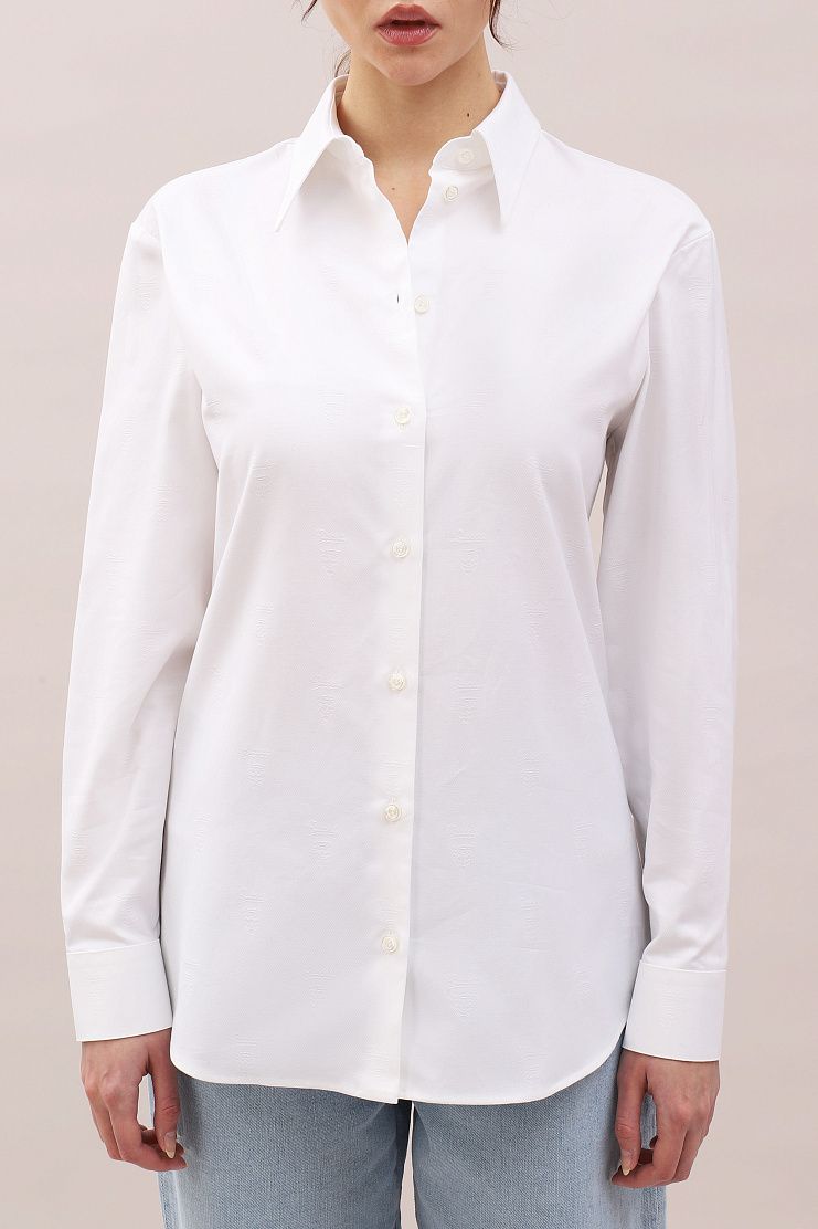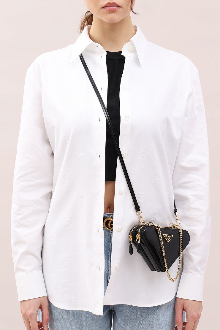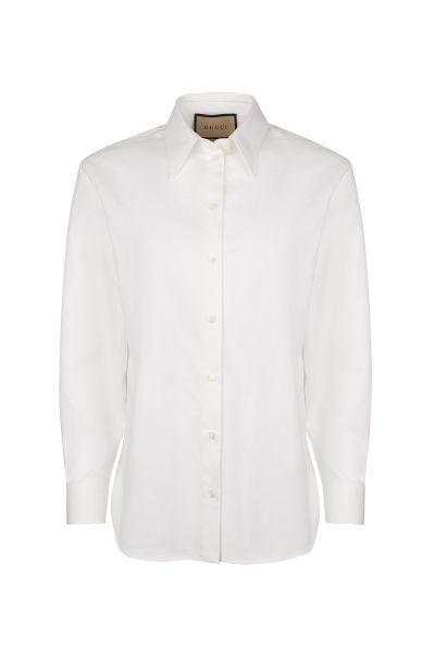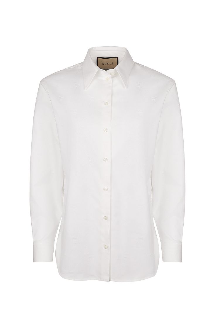 Рубашка из плотного хлопка с фактурным паттерном в виде прописного логотипа Gucci и эмблемы бренда. Модель свободного кроя имеет отложной воротник и застежку на пуговицы.