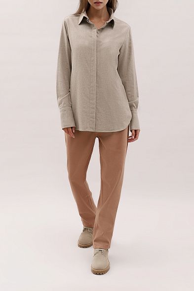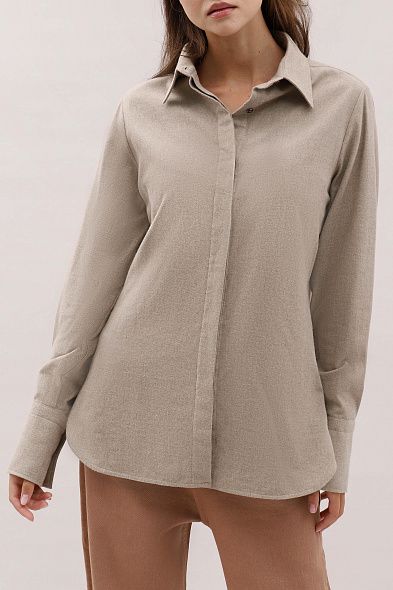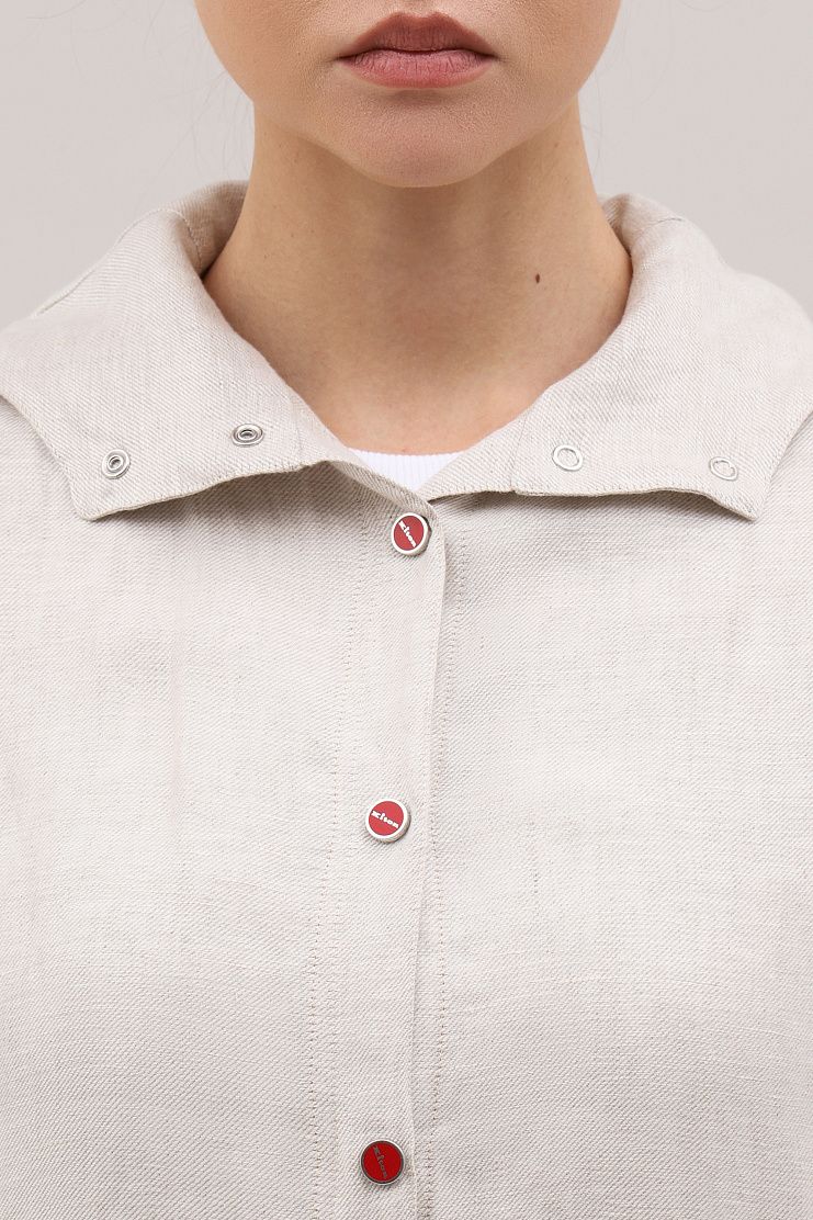 Удлиненная рубашка с капюшоном сшита из фактурного дышащего льна. Модель свободного кроя с закругленными боковыми разрезами и карманами застегивается на кнопки фирменного красного цвета.