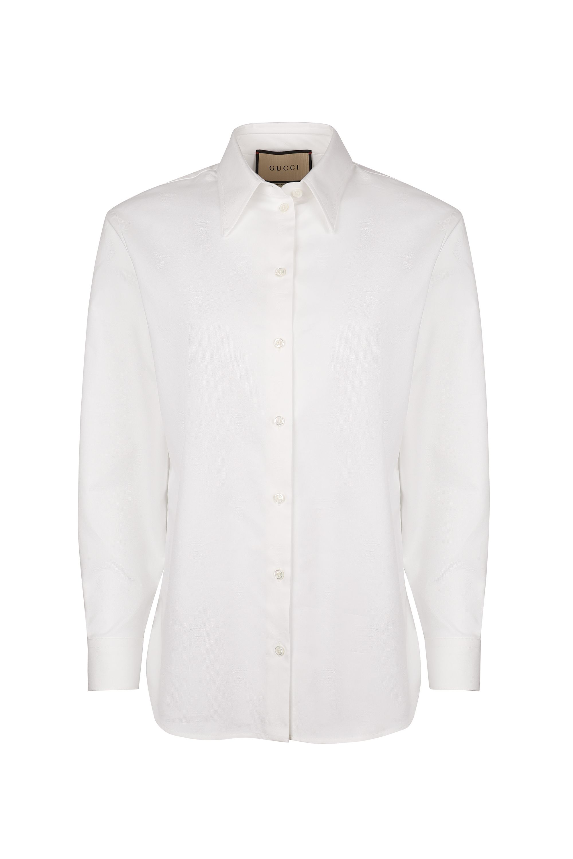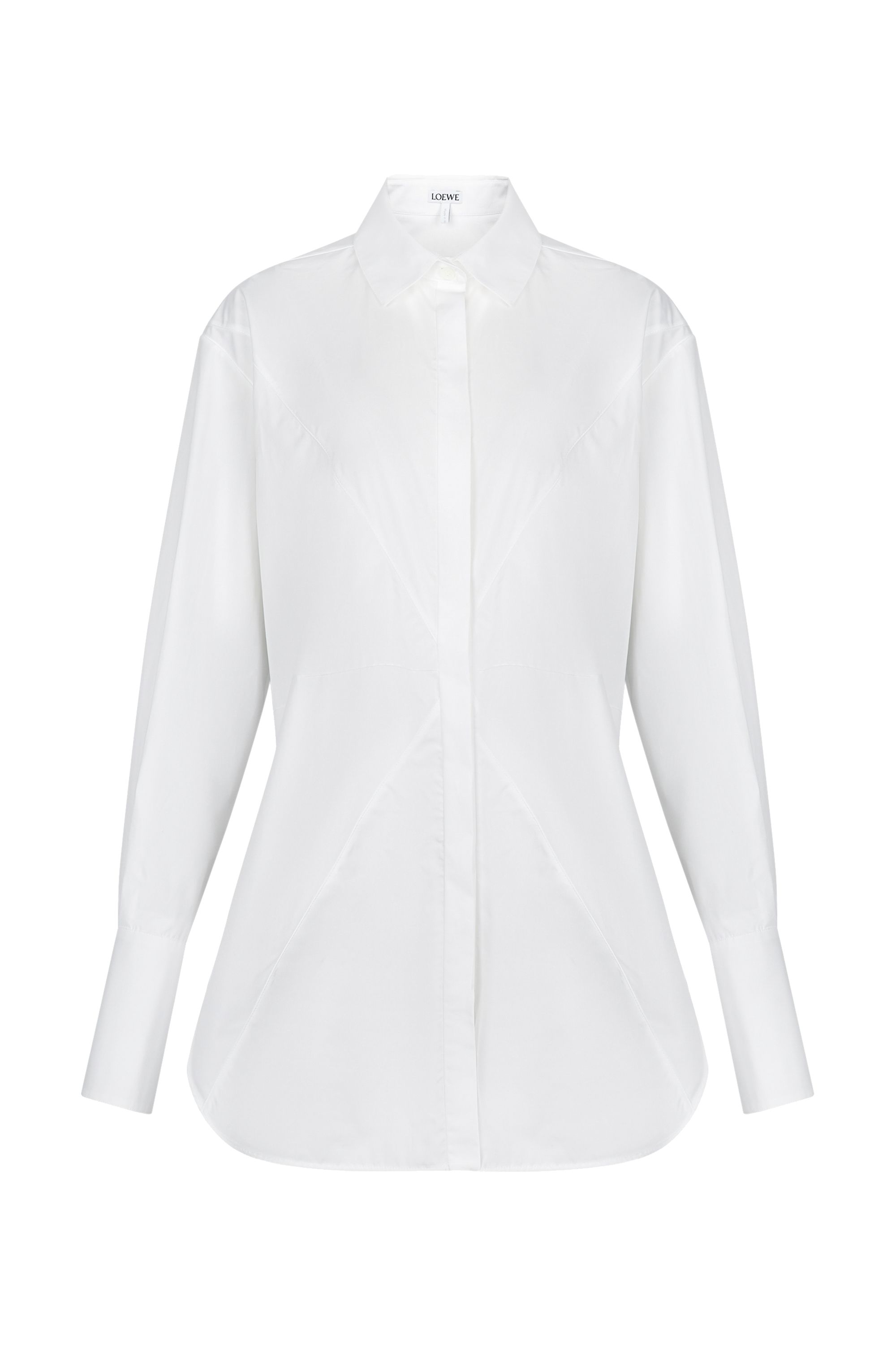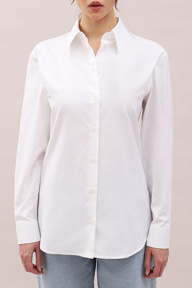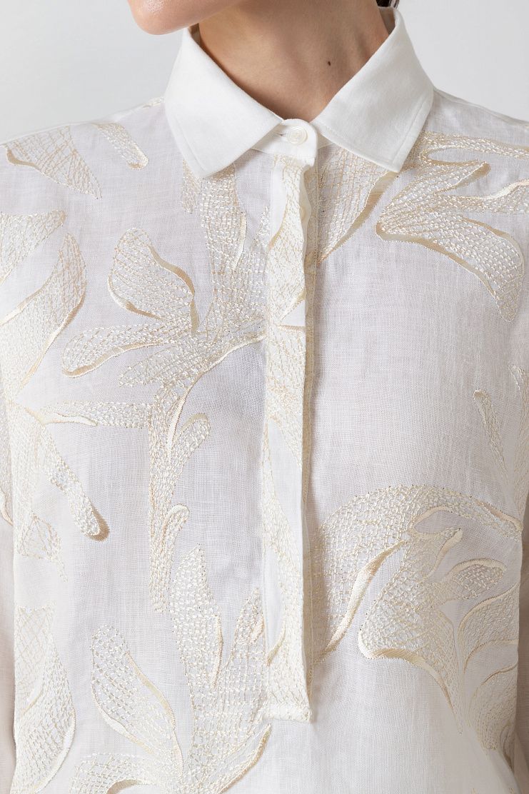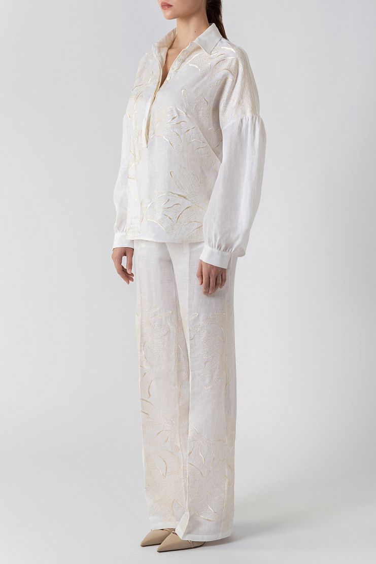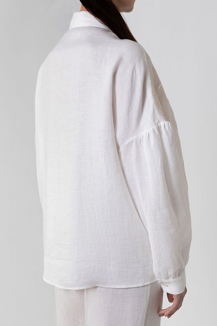 Свободную рубашку со спущенной линией плеч и объемными рукавами сшили из чистого льна. Модель с отложным воротником и планкой с потайными пуговицами украсили эффектной вышивкой.