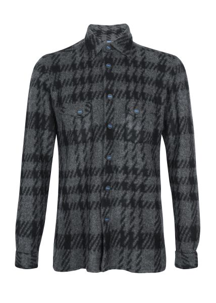 Рубашка синего цвета с эффектом джинсовой ткани. Модель с капюшоном, наклонными боковыми карманами и застежкой на кнопки.