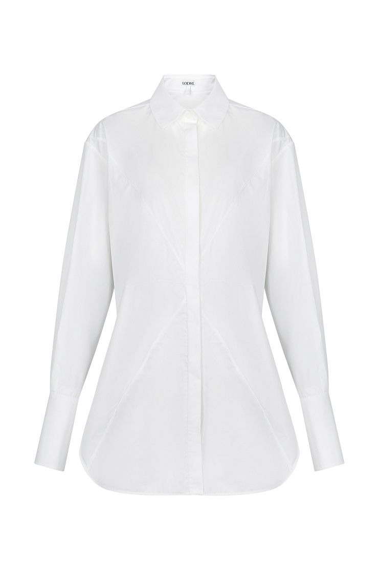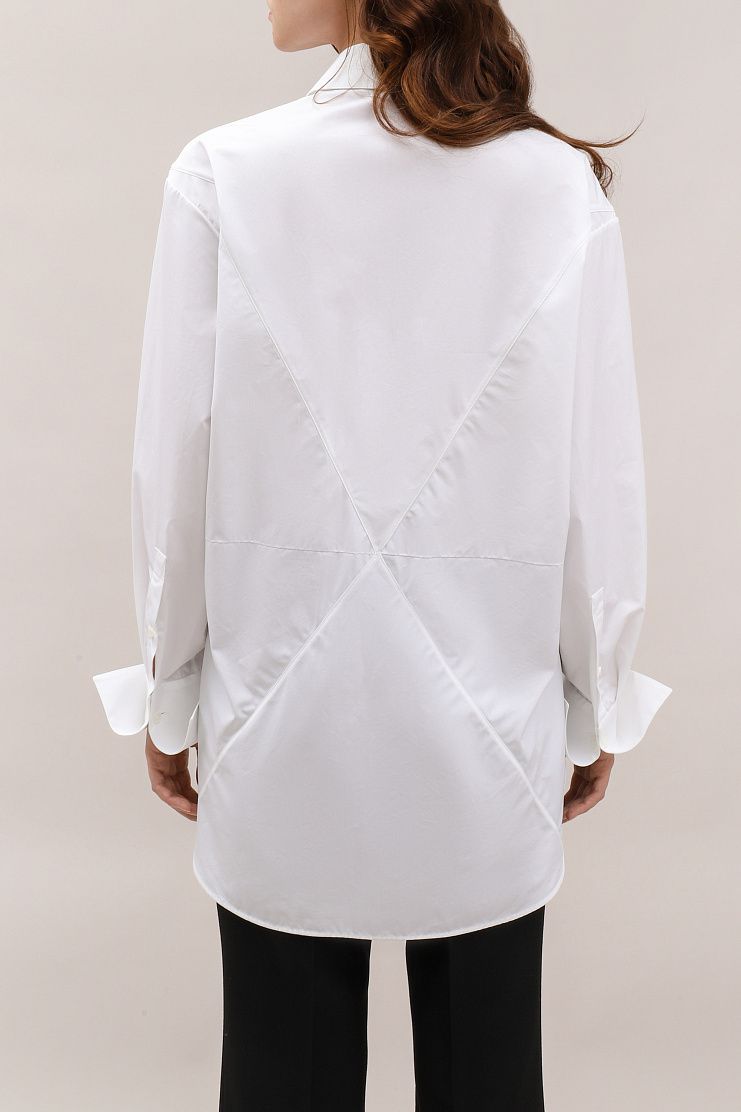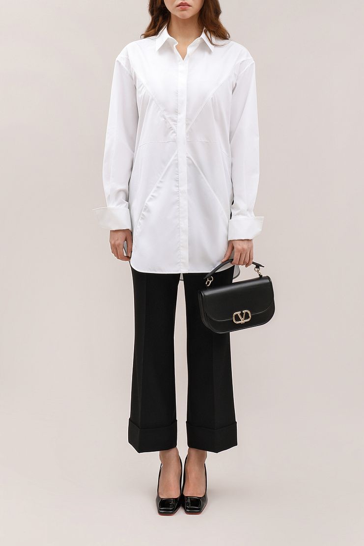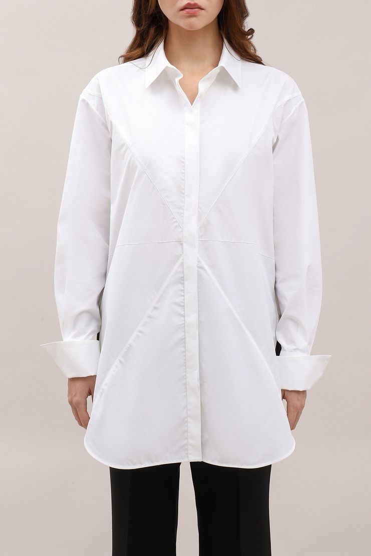 Свободную рубашку сложного кроя выполнили из легкого хлопка. Модель со спущенной линией плеча и отложным воротником застегивается на скрытые под планкой пуговицы.