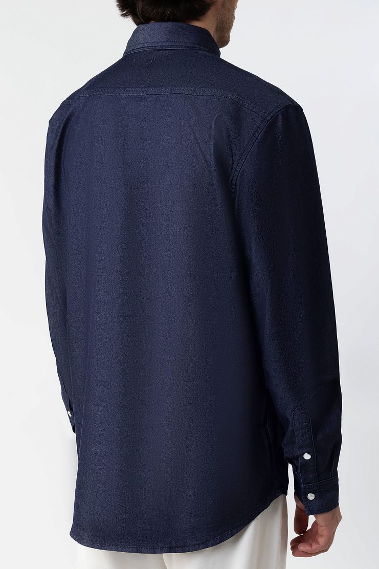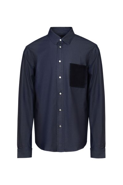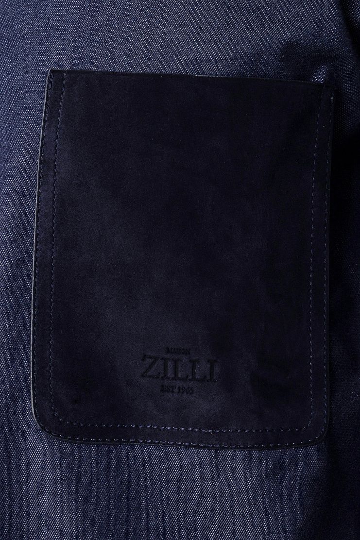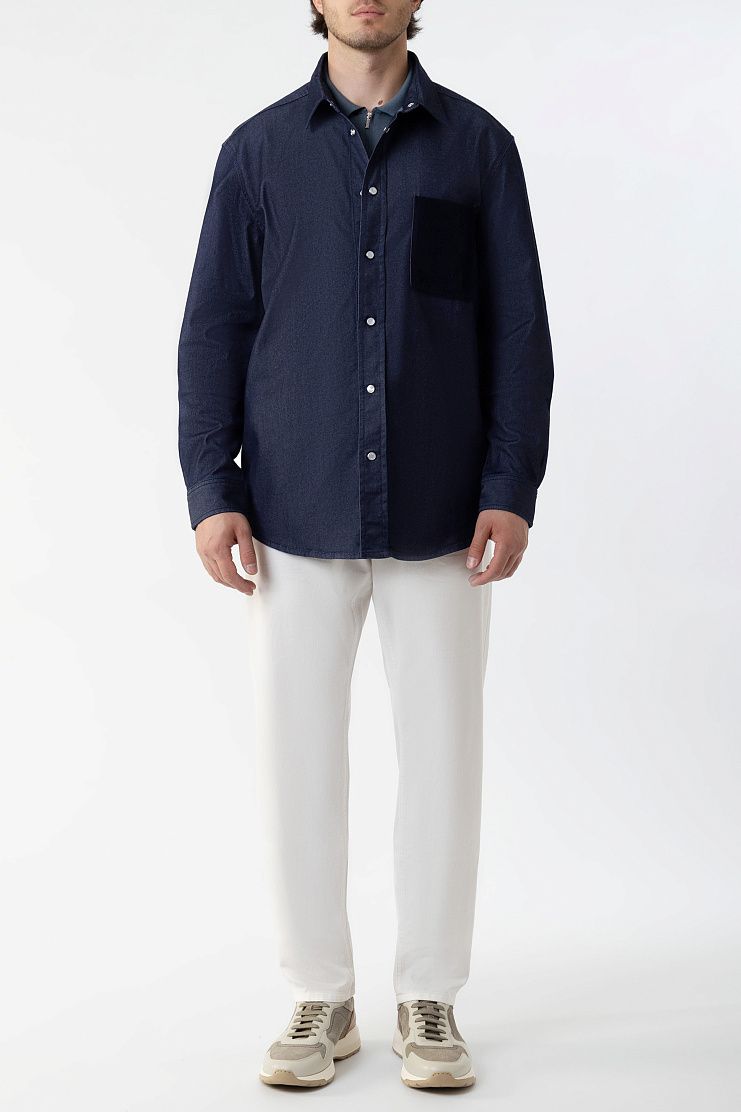 Рубашку прямого кроя сшили из джинсовой ткани на основе эластичного хлопка и шелка. Модель с закругленным низом дополнена нагрудным карманом из замши и застегивается на кнопки.