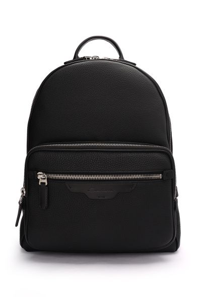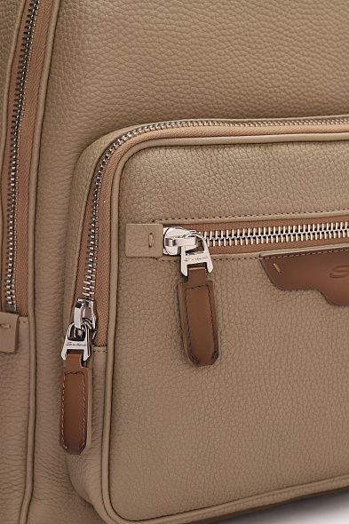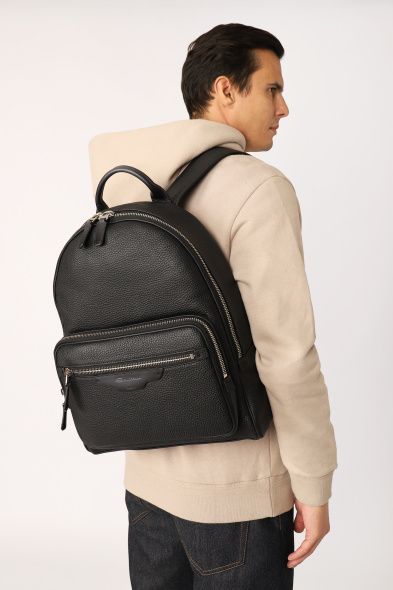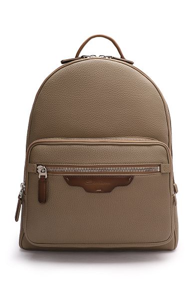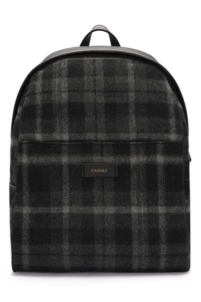 Рюкзак сшили из зернистой телячьей кожи и плотной шерсти с классическим клетчатым узором, дополнив текстильной сетчатой вставкой на задней панели. Модель с небольшой ручкой сверху и регулируемыми плечевыми ремнями удобно носить разными способами. Внутри — карман на молнии.
