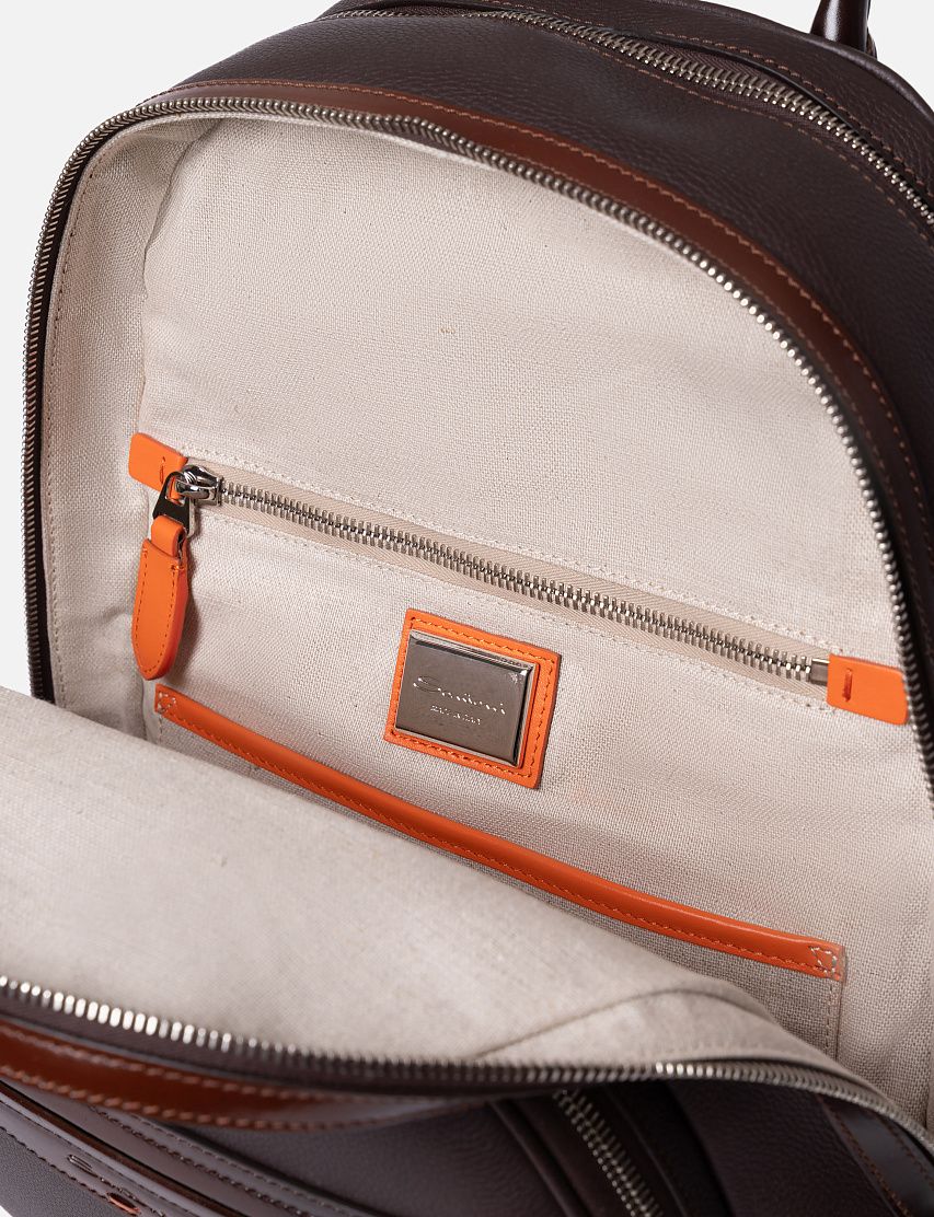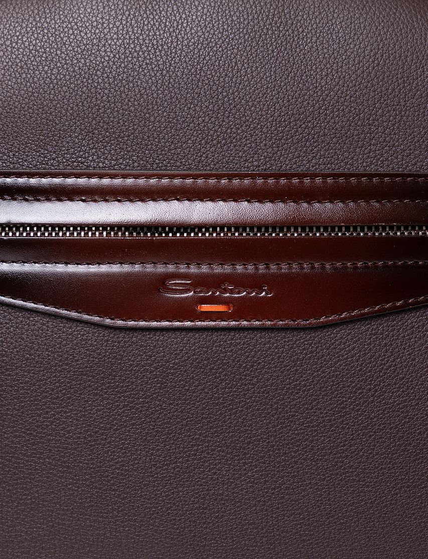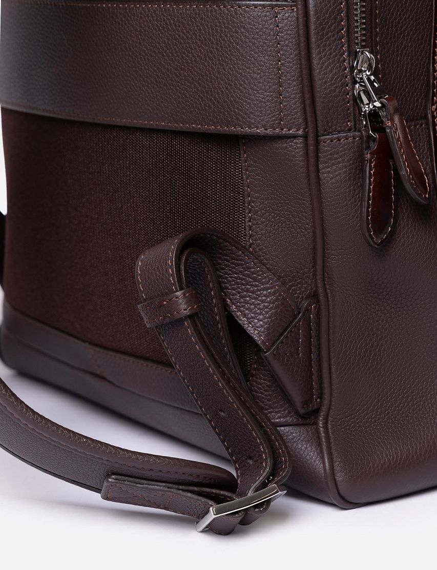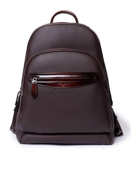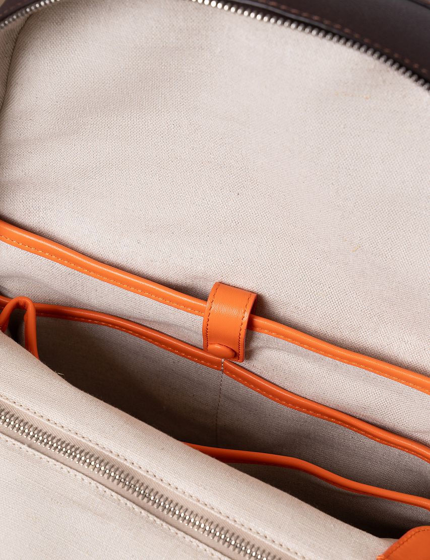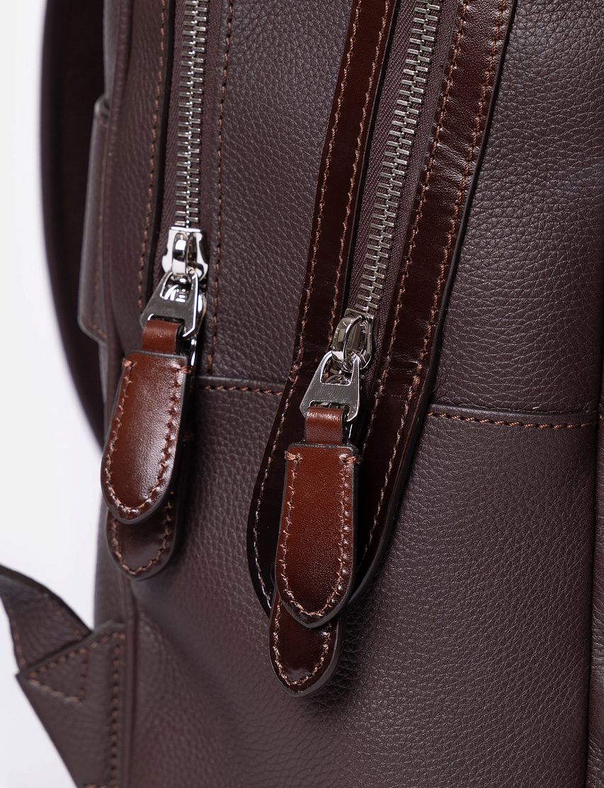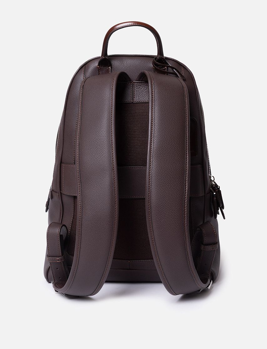 Рюкзак полукруглой формы выполнили из прочной зернистой кожи, а декоративную отделку — из гладкой. Модель с короткой ручкой и широкими плечевыми ремнями дополнили крупным карманом на лицевой панели и сетчатой текстильной вставкой на спинке. Внутри расположены два вместительных отделения на молниях.