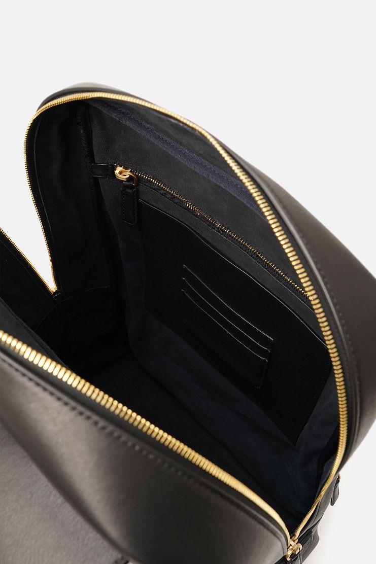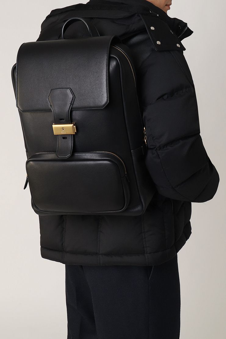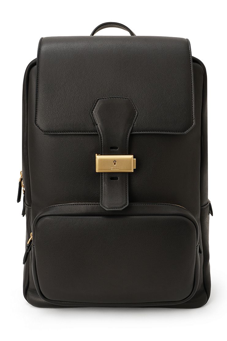 Рюкзак выполнен из гладкой и блестящей телячьей кожи. Несмотря на свою мягкость, она обладает высокой прочностью и устойчивостью к царапинам, заломам и деформации. Модель дополнена короткой ручкой, двумя регулируемыми плечевыми ремнями и карманом на молнии. Внутри, помимо основного отделения, предусмотрено также место для ноутбука и карманы для кредитных карт. Рюкзак застегивается на молнию и клапан с застежкой из латуни