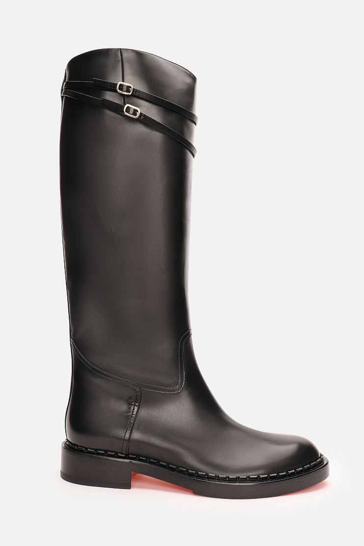Сапоги из гладкой кожи с округлым носком, широким голенищем и двумя тонкими ремешками отличаются удобством и идеально подойдут для образа на каждый день. Модель на низком широком каблуке имеет кожаную подкладку, застежку на боковую молнию и резиновую подошву с выступом.