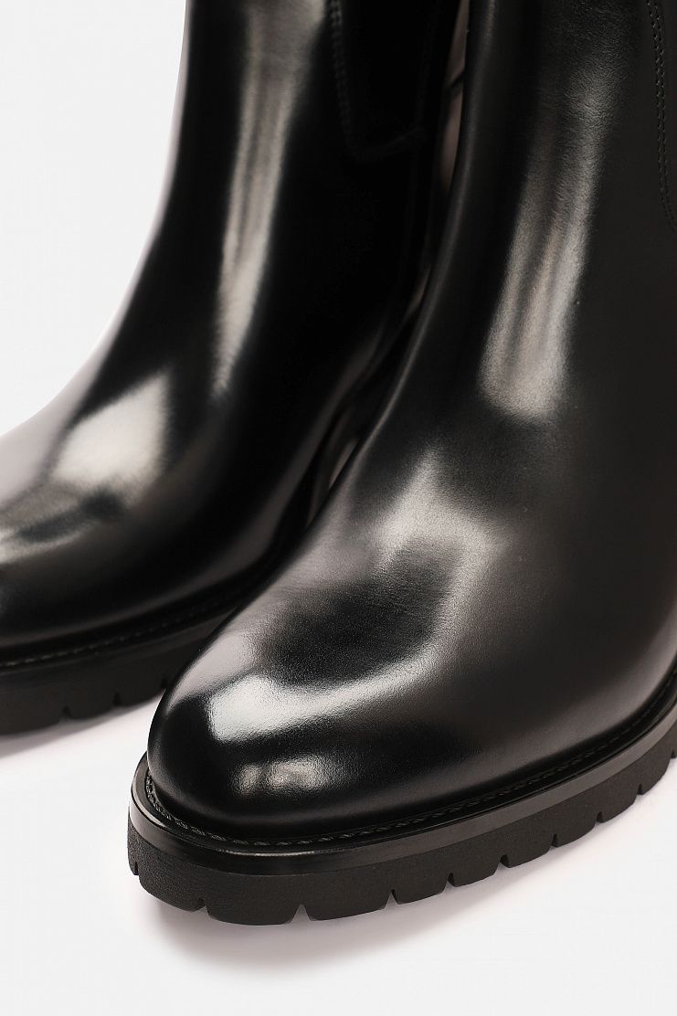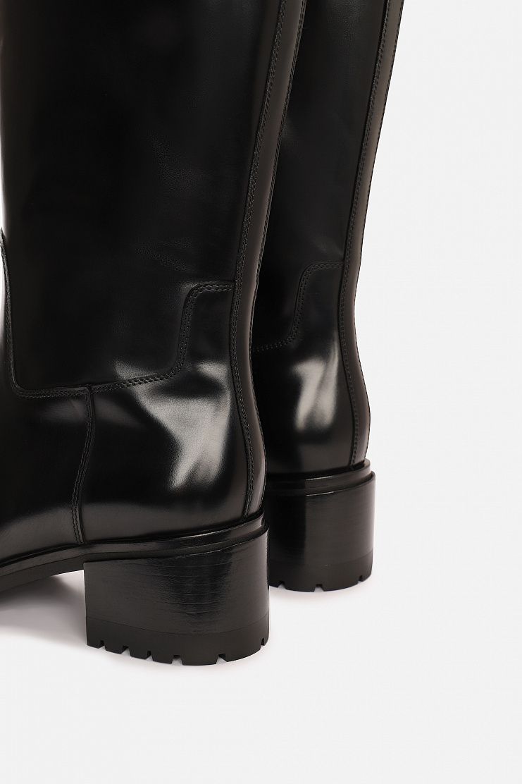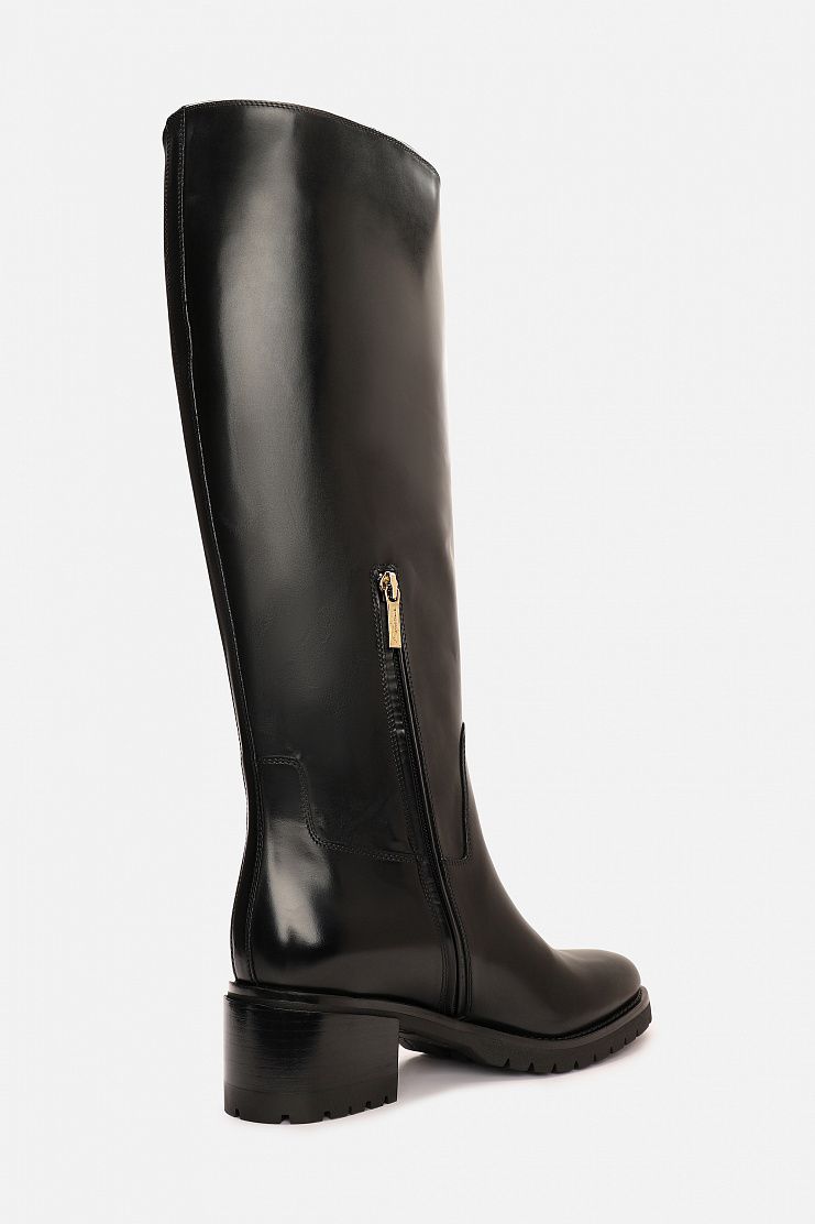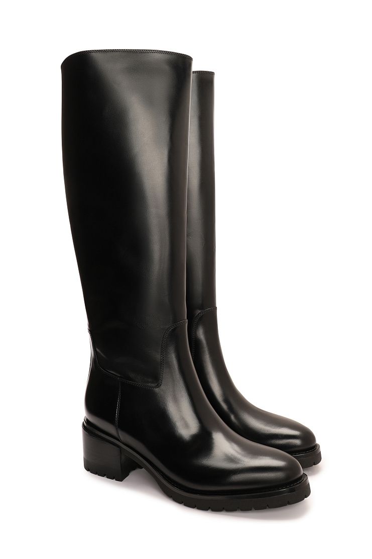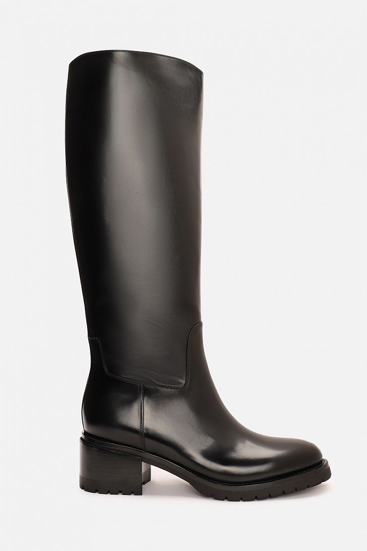 Сапоги из гладкой кожи с широким голенищем превосходно подойдут для образа на каждый день. Модель на среднем широком каблуке имеет кожаную подкладку, боковую застежку на молнию и резиновую подошву с протекторами.
