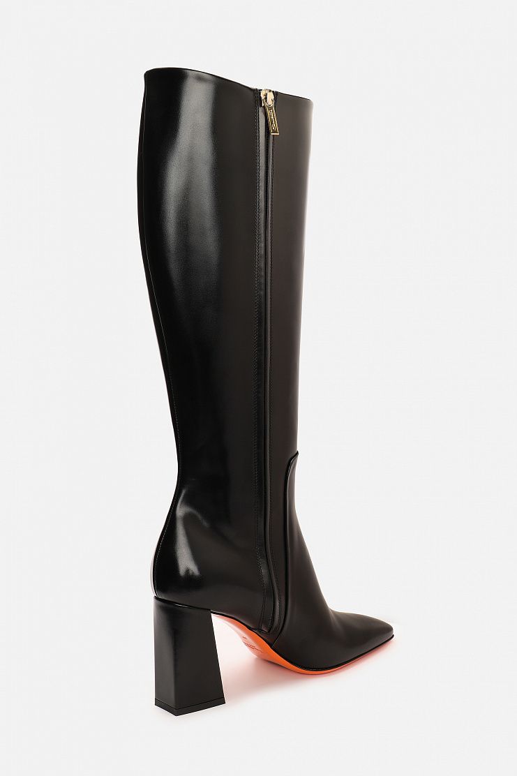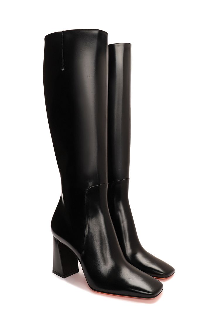 Сапоги из гладкой кожи с трендовыми квадратными носами на высоком трапецевидном каблуке имеют классический силуэт и прекрасно подойдут для элегантного образа. Модель на кожаной подкладке и резиновой подошве.