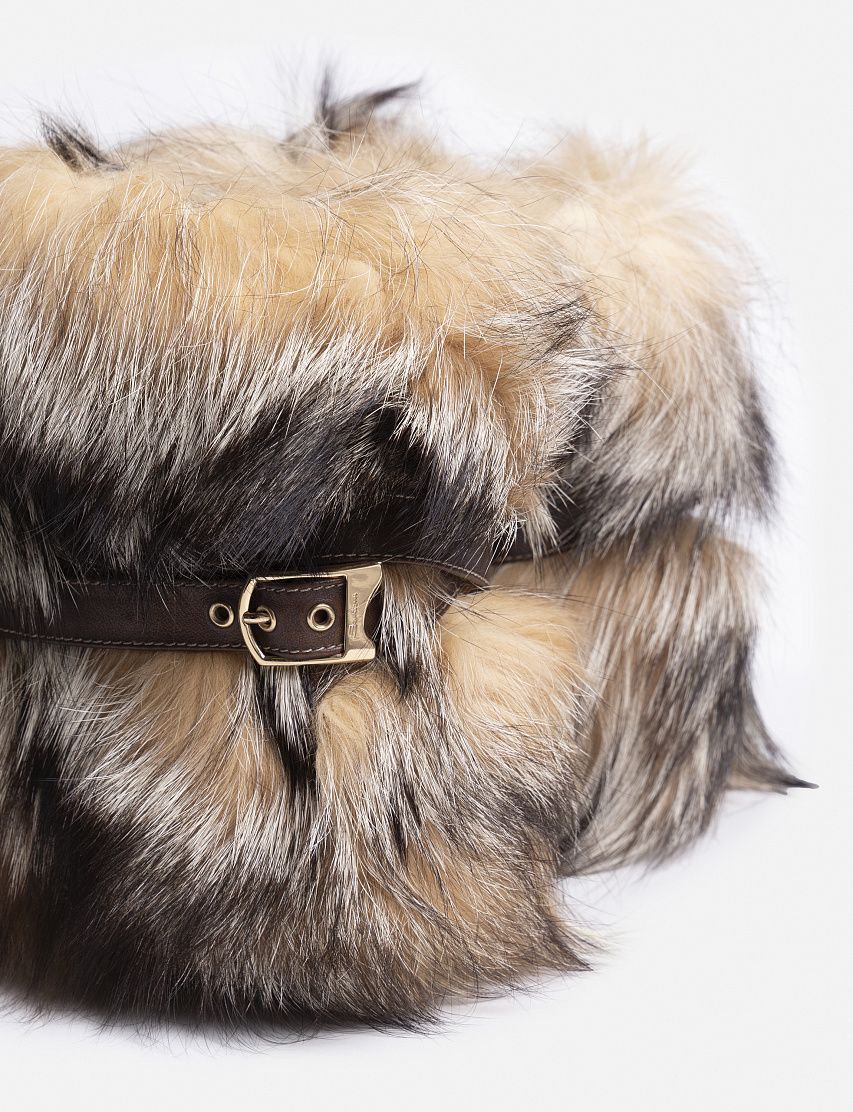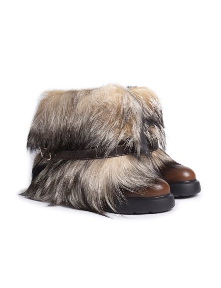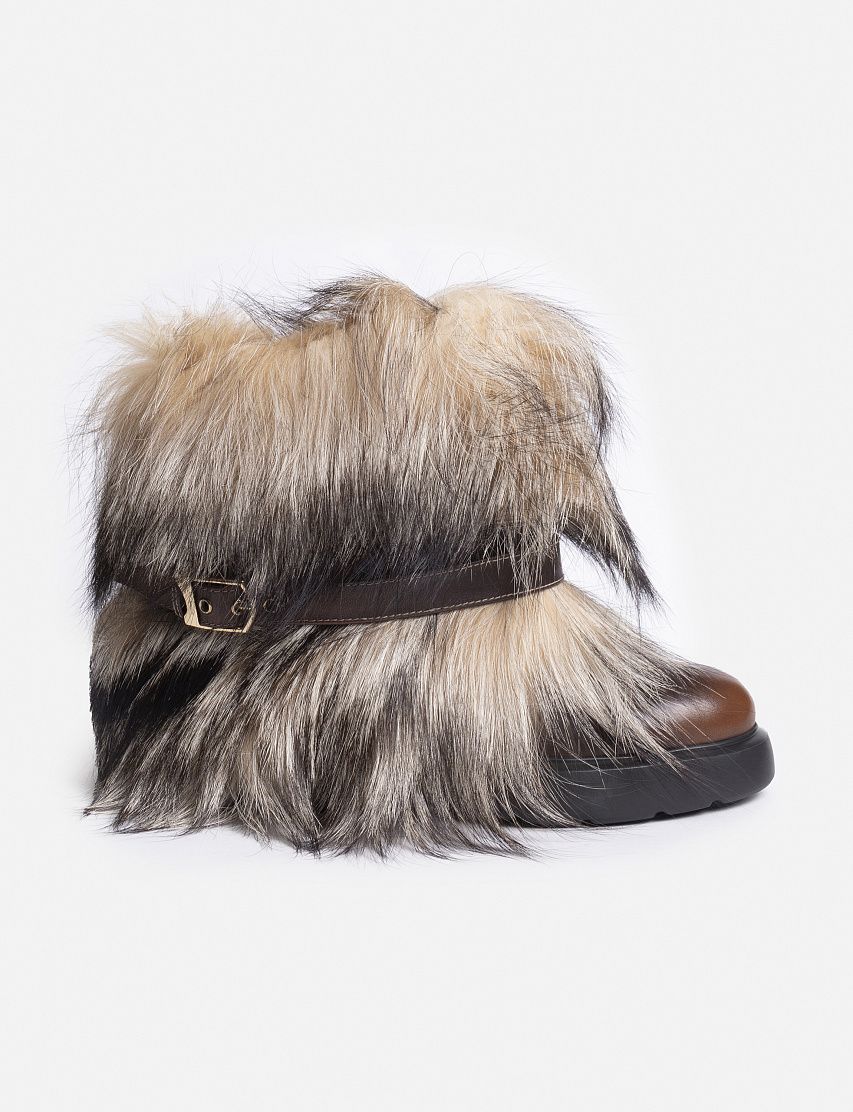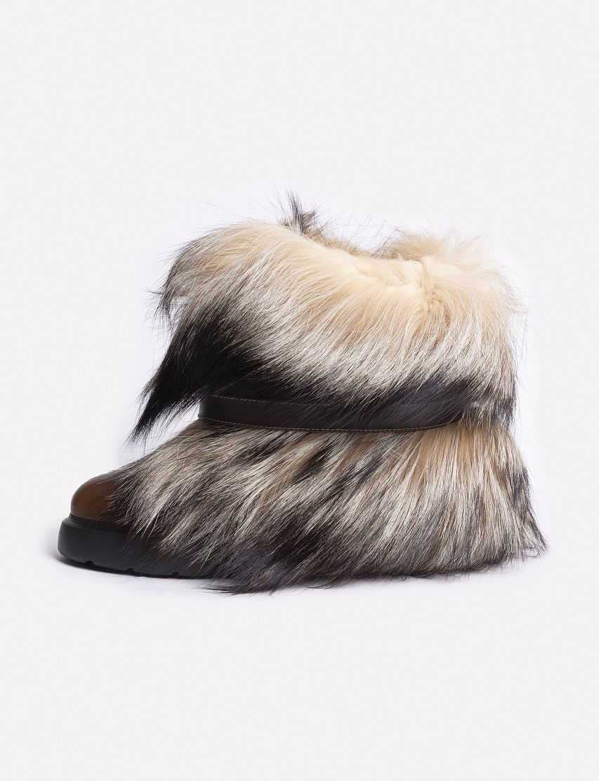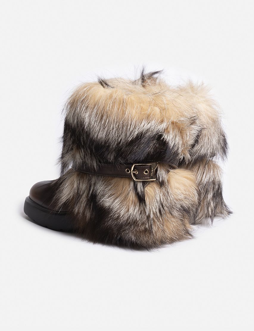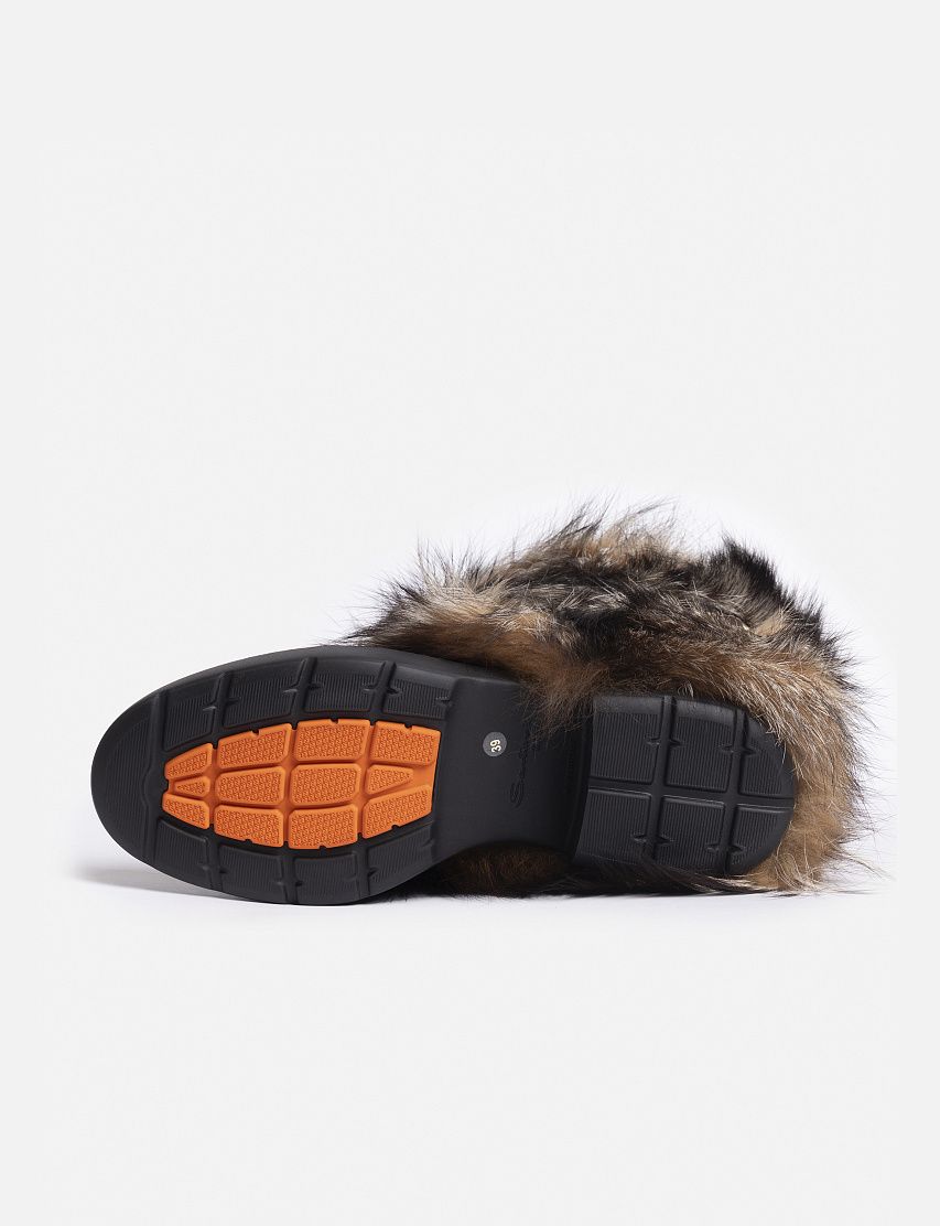 Сапоги из гладкой телячьей кожи, окрашенной в технике velatura, дополнили объемной опушкой из меха лисы. Модель на массивной резиновой подошве и каблуке декорировали узким ремешком с брендированной золотистой пряжкой Double Buckle. Благодаря широкому голенищу пару удобно надевать и снимать.
