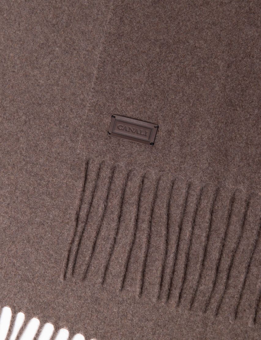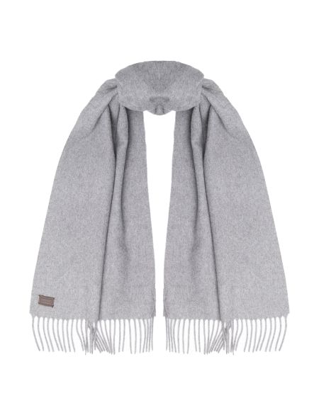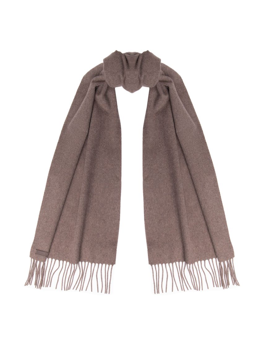 Широкий шарф из чистого кашемира прекрасно дополнит зимний гардероб. Аксессуар с бахромой по краям декорировали кожаным патчем с тисненым логотипом.
