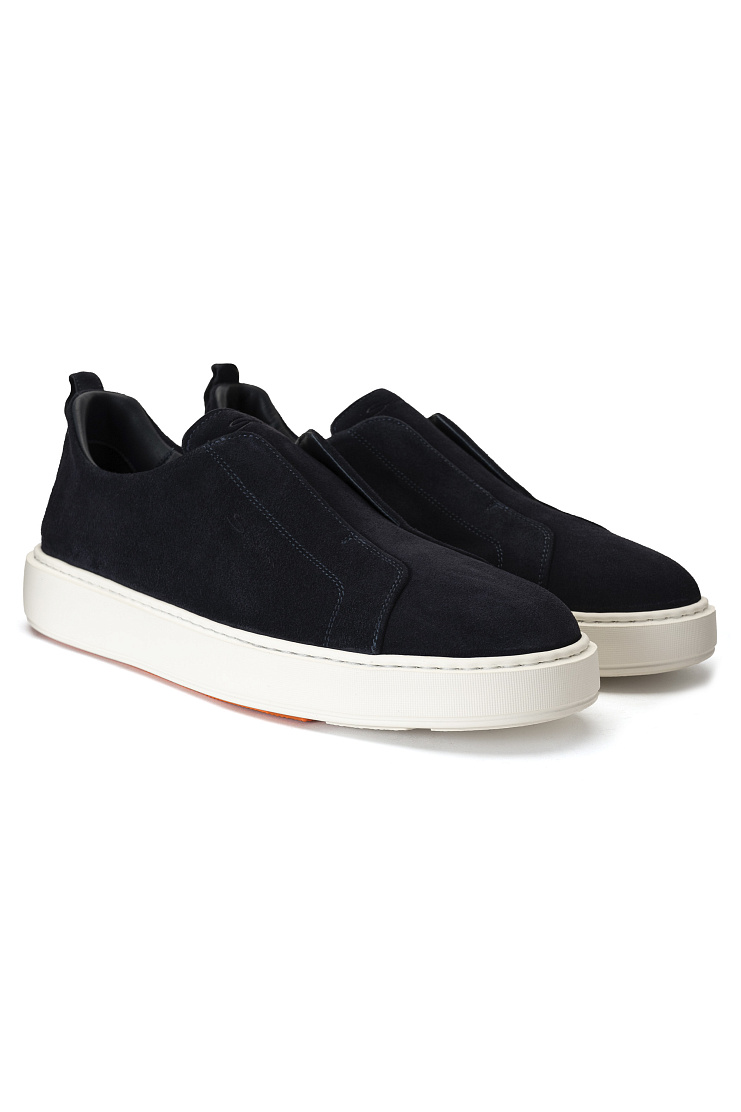Слипоны сшили из эластичной бархатистой замши, а внутреннюю часть отделали гладкой кожей. Модель дополнена широкой резиновой подошвой контрастного цвета. Задник с короткой петлей украсили стежком фирменного оранжевого оттенка Arancio Santoni.
