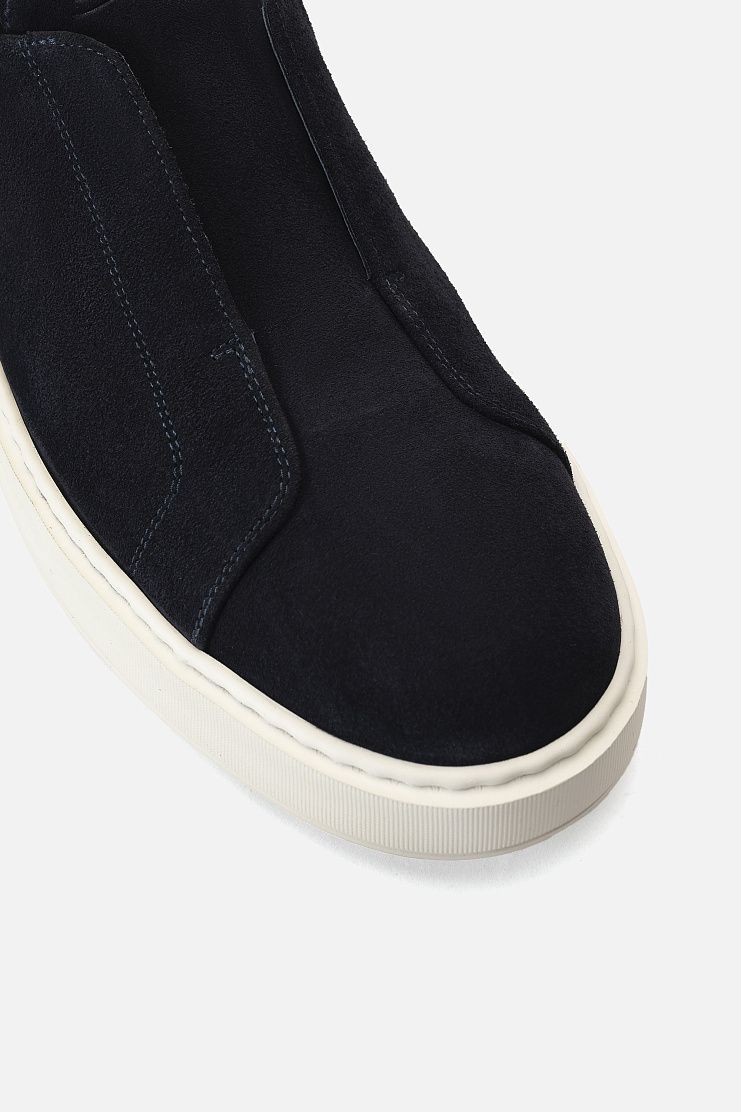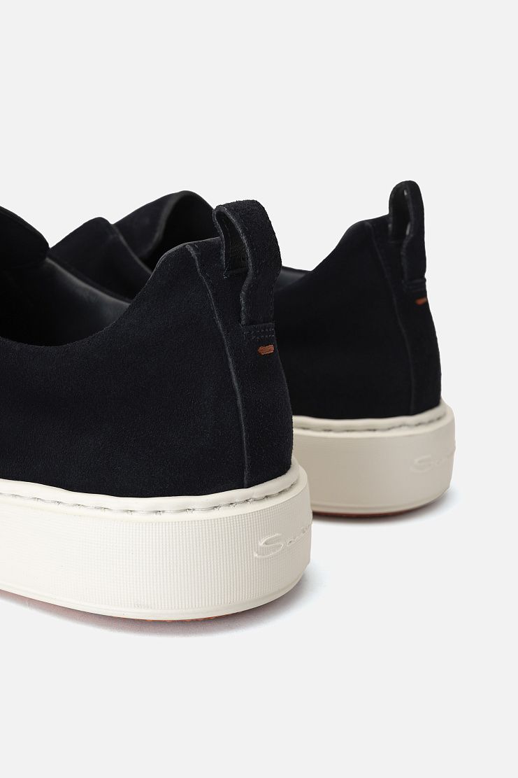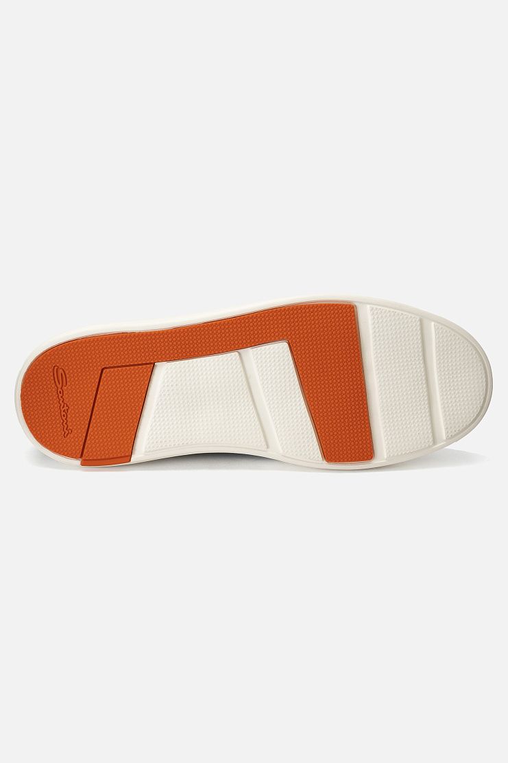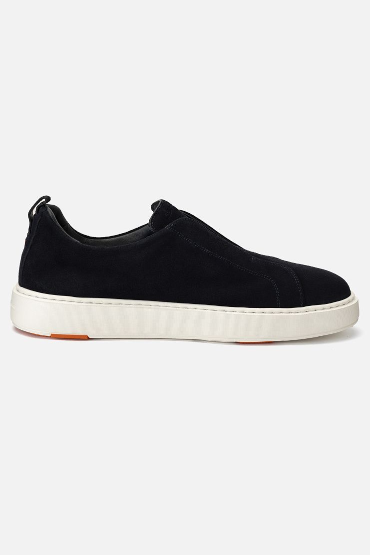 Слипоны сшили из эластичной бархатистой замши, а внутреннюю часть отделали гладкой кожей. Модель дополнена широкой резиновой подошвой контрастного цвета. Задник с короткой петлей украсили стежком фирменного оранжевого оттенка Arancio Santoni.