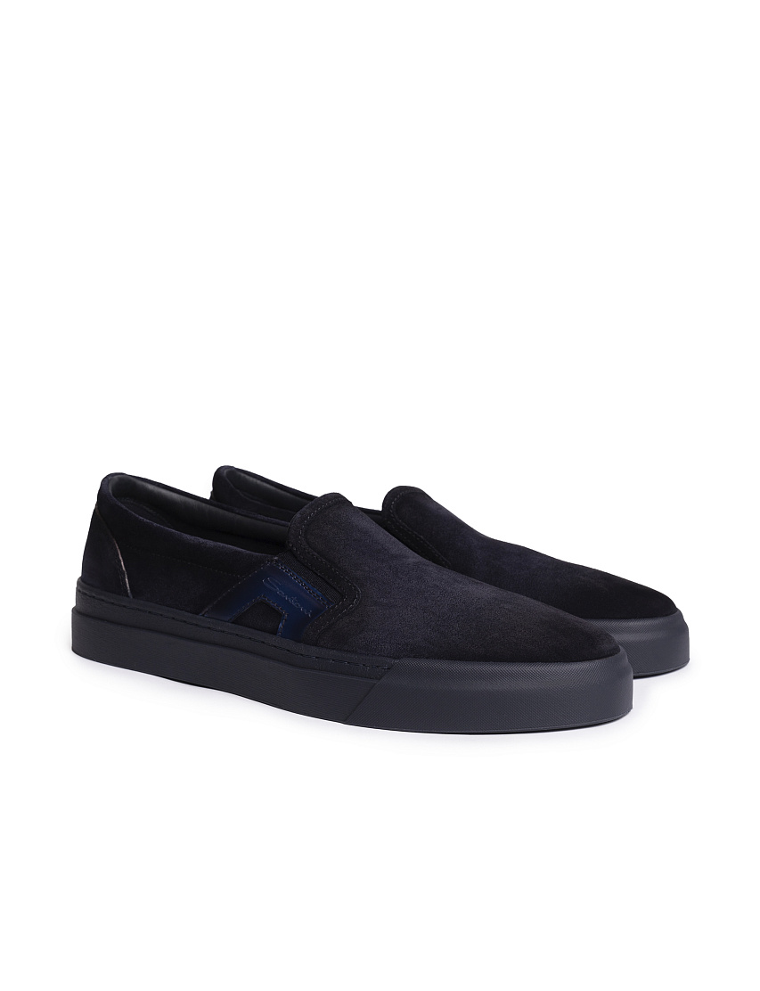 Слипоны на широкой резиновой подошве выполнили из мягкой замши. По бокам пара дополнена вставками из глянцевой кожи, которую окрасили в фирменной технике velatura, чтобы получить эффект патины. Тисненый логотип и стежок оттенка Arancio Santoni указывают на принадлежность к бренду.