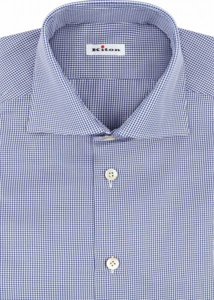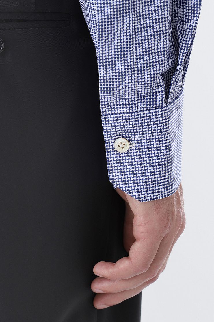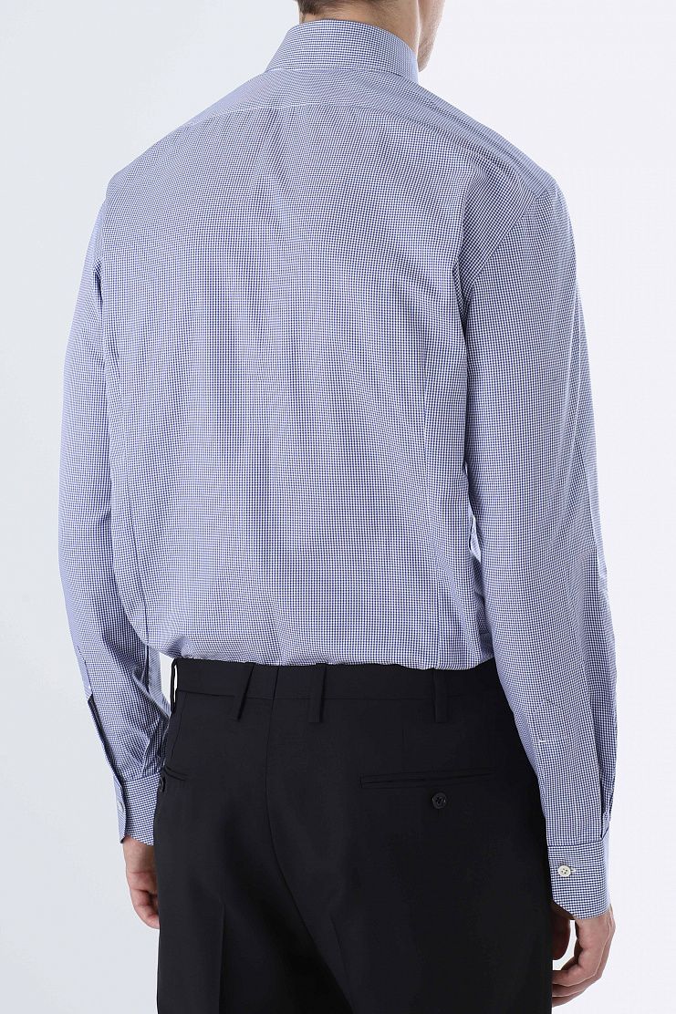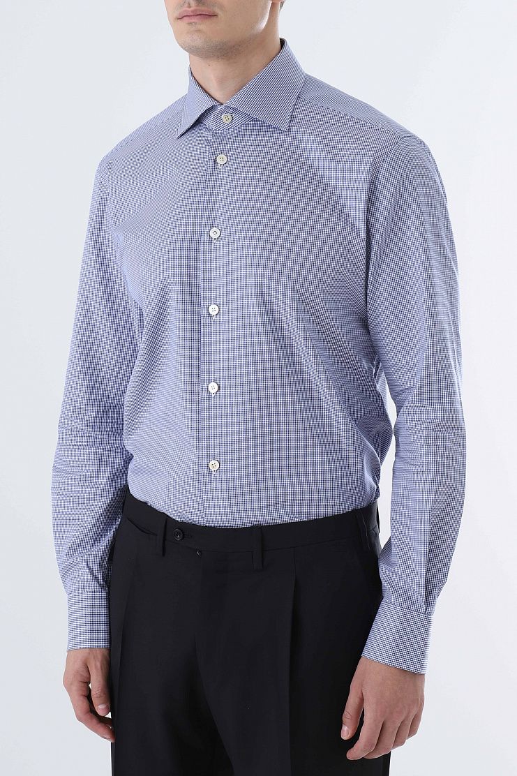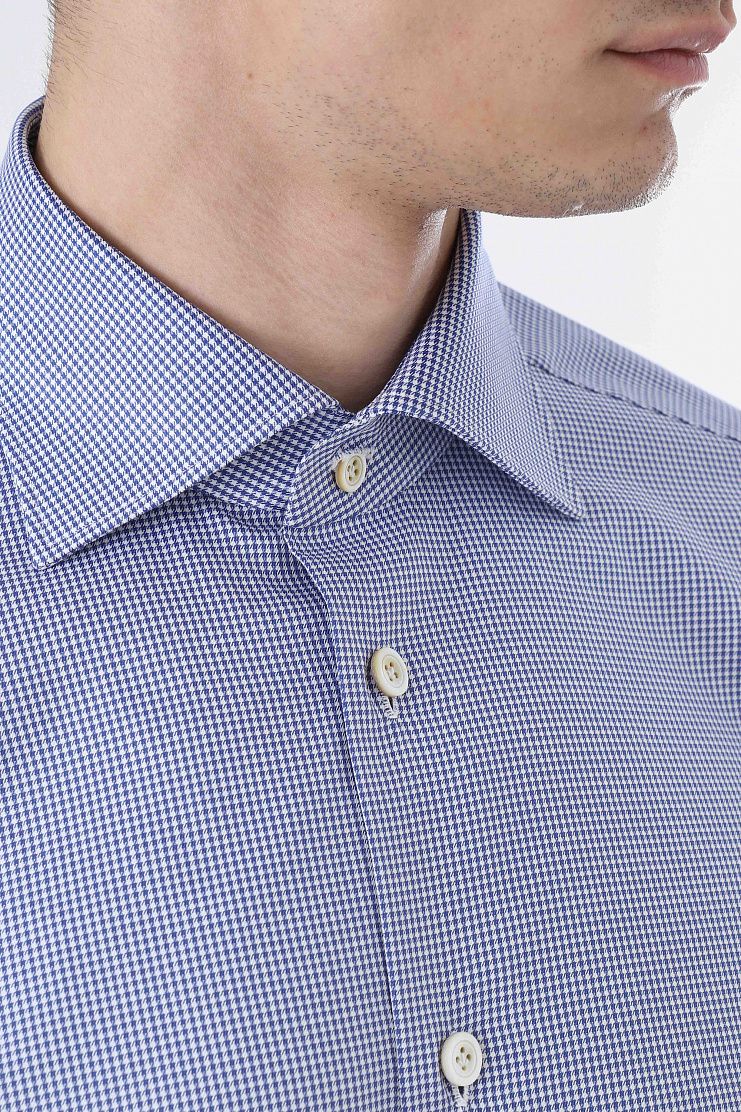 Сорочка с мелким узором гленчек выполнена из натурального хлопка. Изделие свободного кроя, с отложным воротником и застежкой на пуговицы. Модель идеально подойдет для офисного делового стиля.