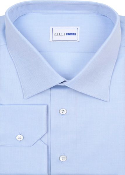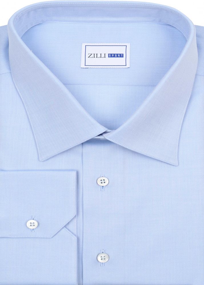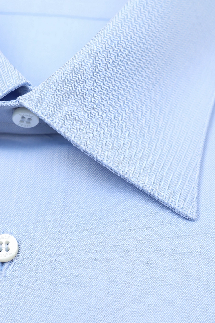 Сорочка голубого цвета с мелким рисунком в елочку из чистого хлопка. Модель классического кроя, с отложным воротником.