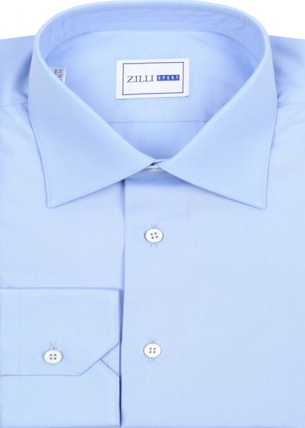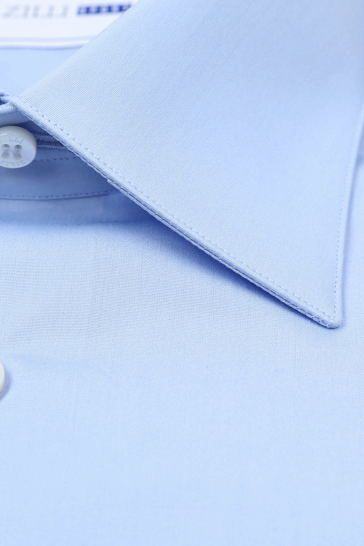 Однотонная сорочка голубого цвета выполнена из чистого хлопка. Модель классического кроя, с отложным воротником.