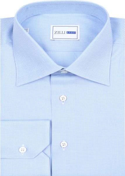 Сорочка в мелкую голубую клетку выполнена из чистого хлопка. Модель классического кроя, с отложным воротником.