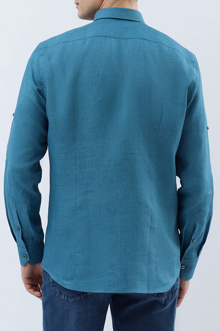 Сорочка из льняной фактурной ткани с вышивкой в виде льва на груди. Модель свободного кроя имеет отложной воротник и застежку на пуговицы.