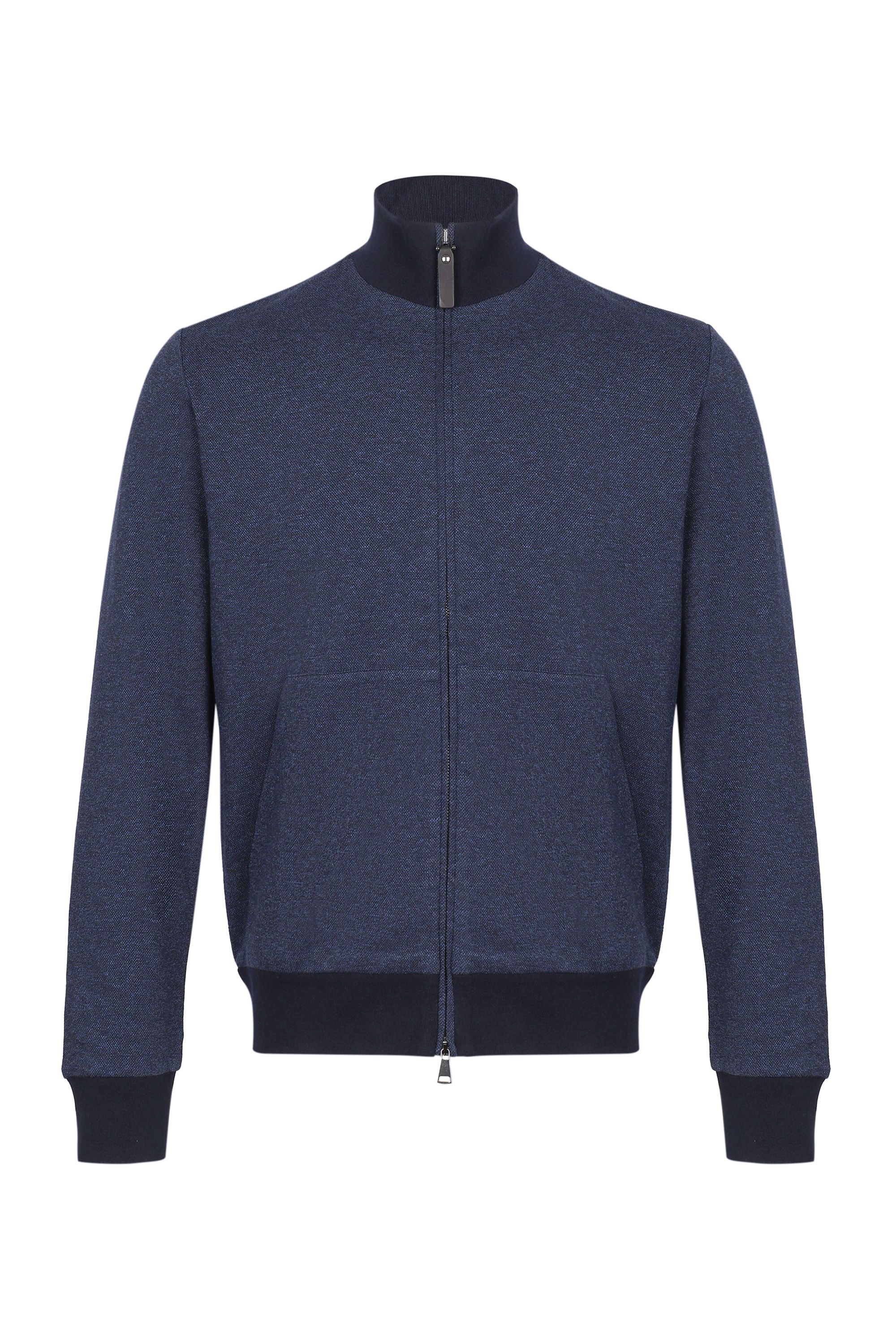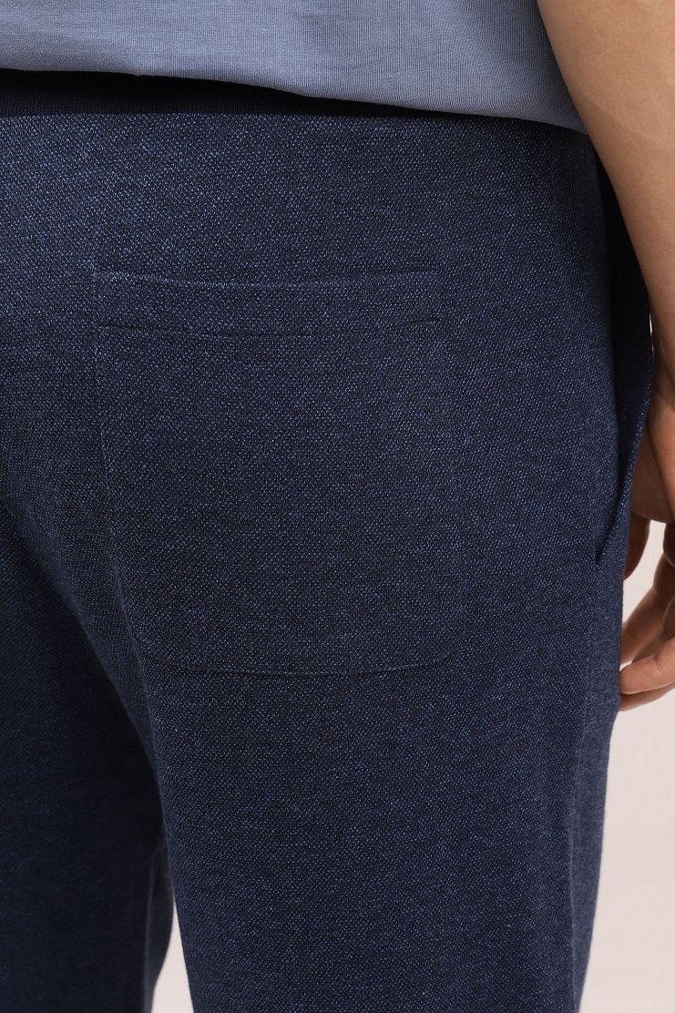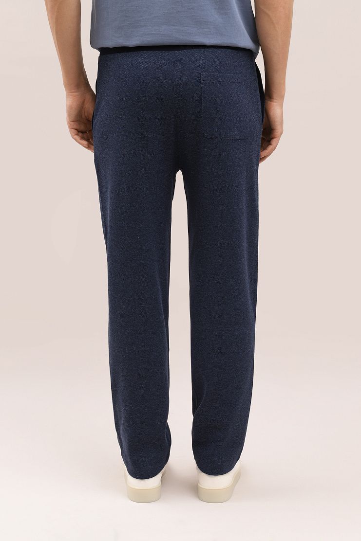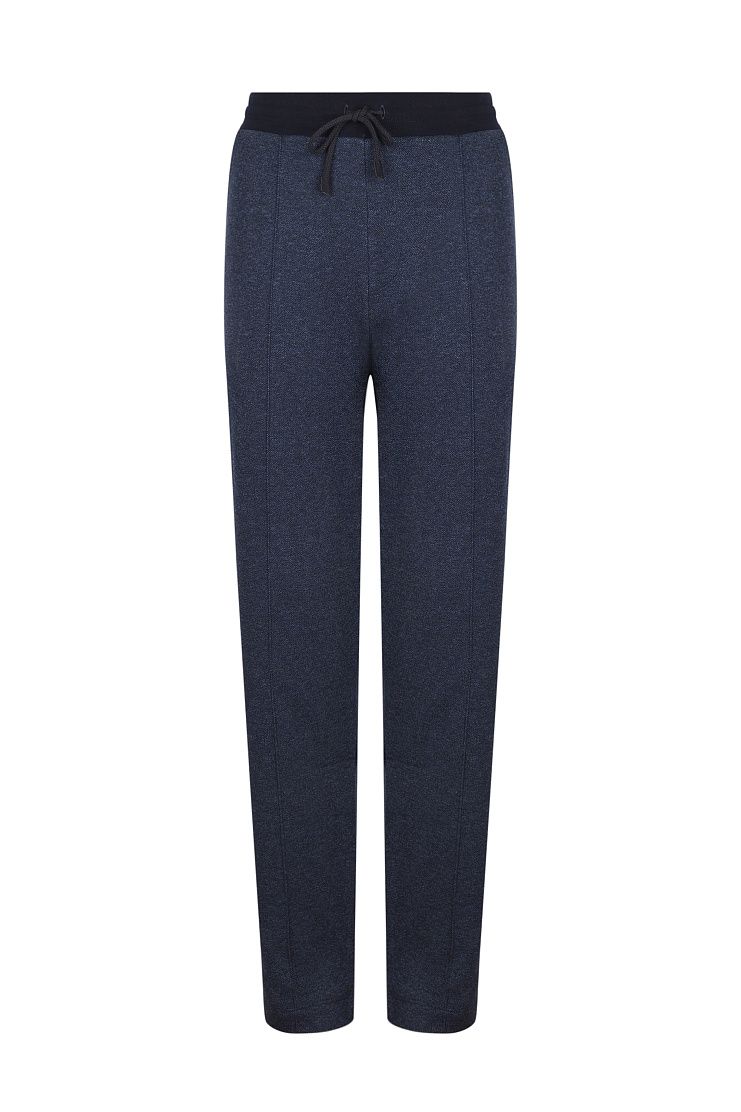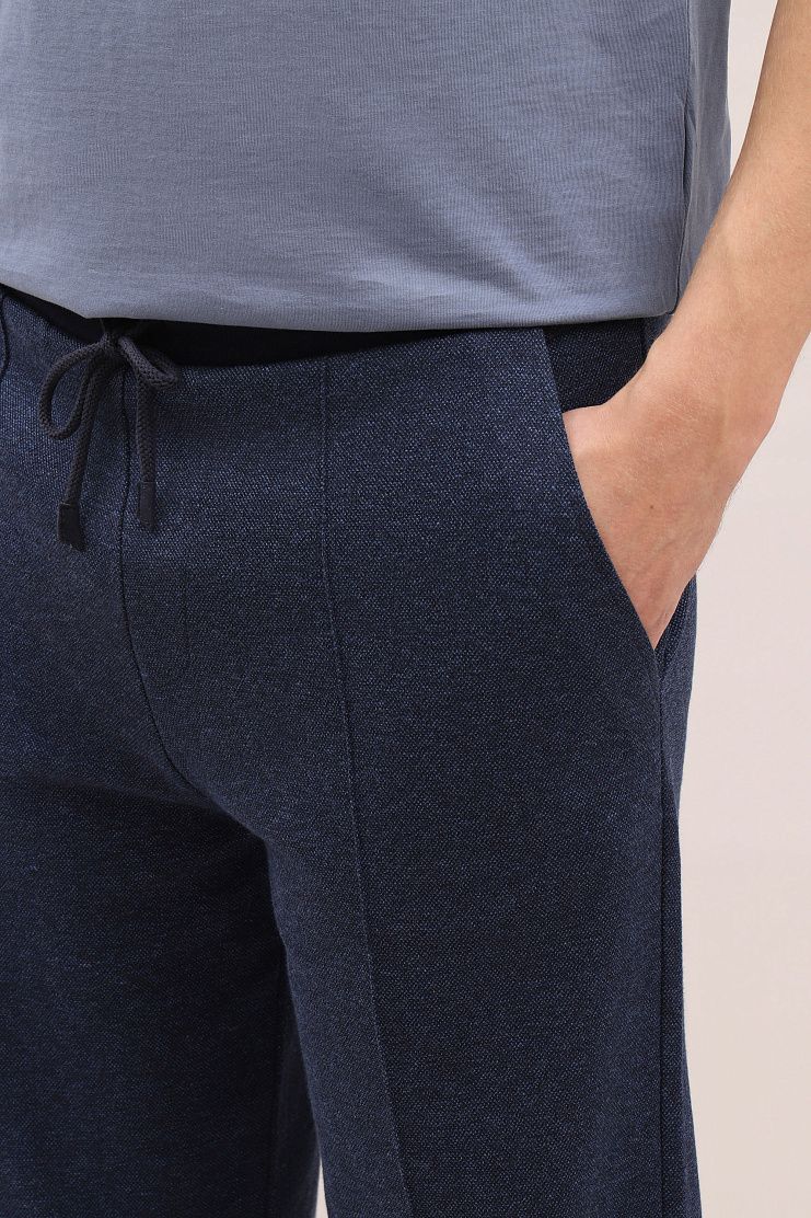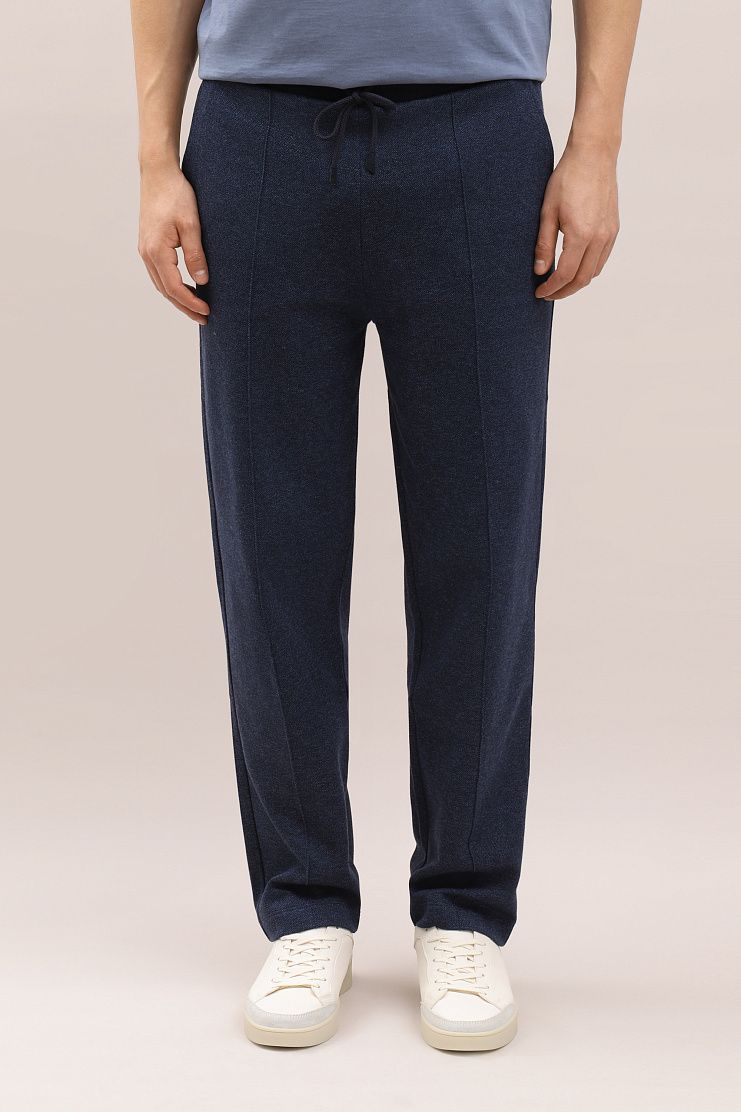 Брюки из меланжевой ткани темно-синего цвета отлично подойдут для образа в стиле sport-casual. Модель свободного кроя с прошитыми стрелками имеет боковые карманы, накладной задний карман и эластичный пояс на кулиске.