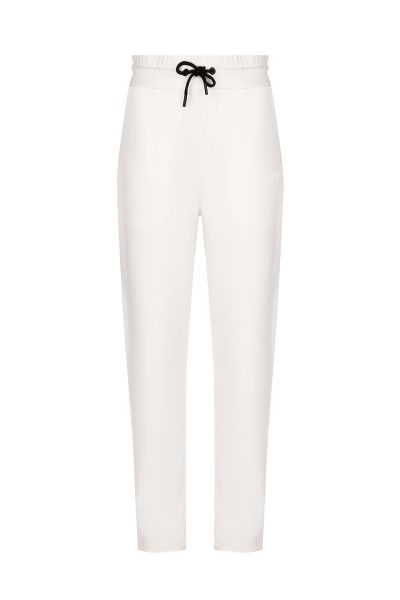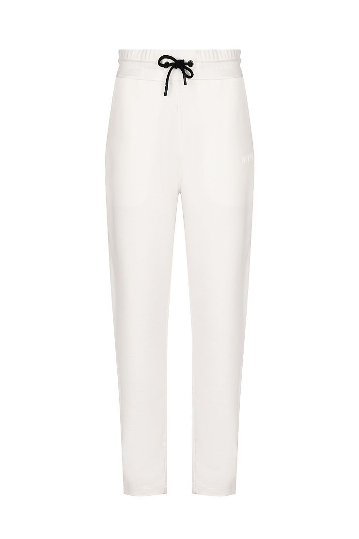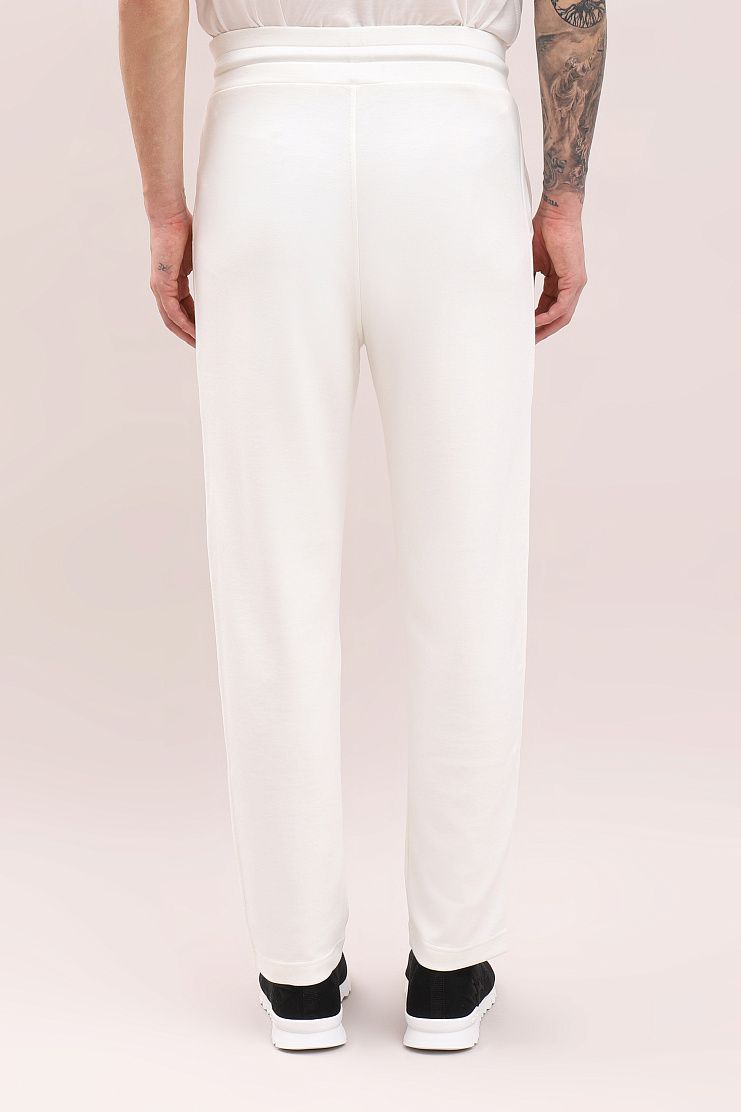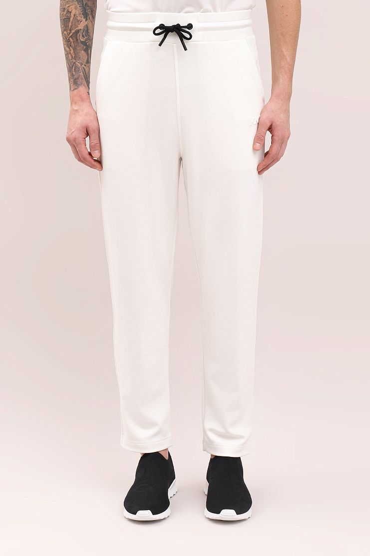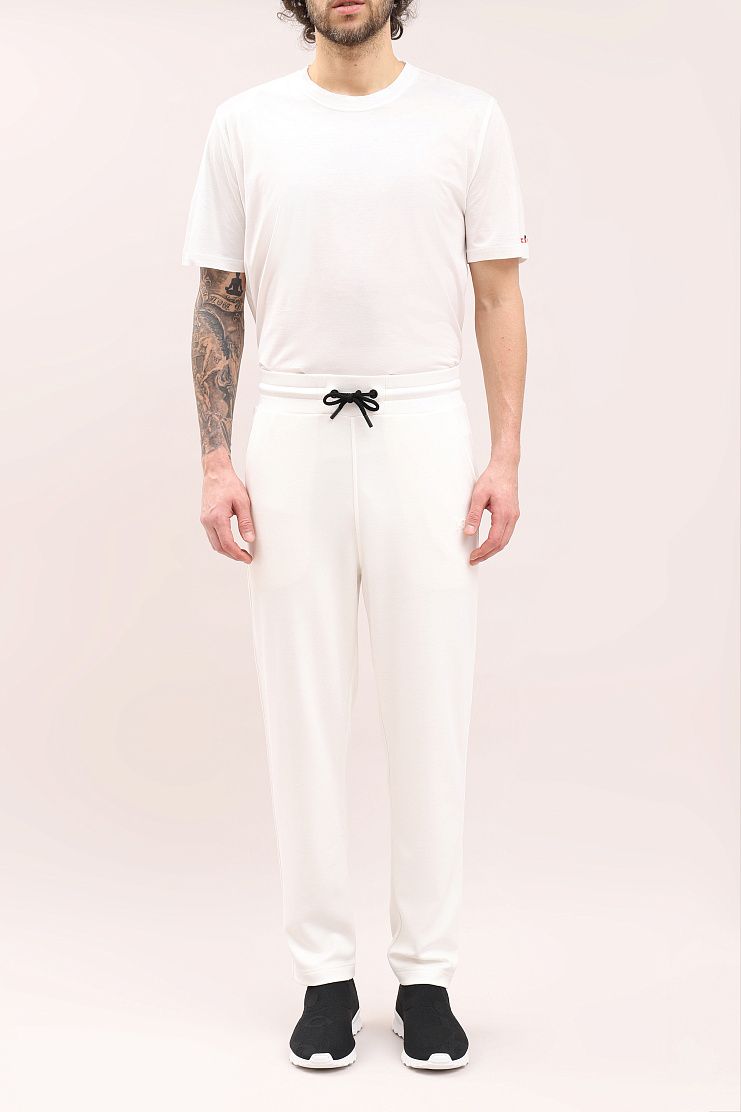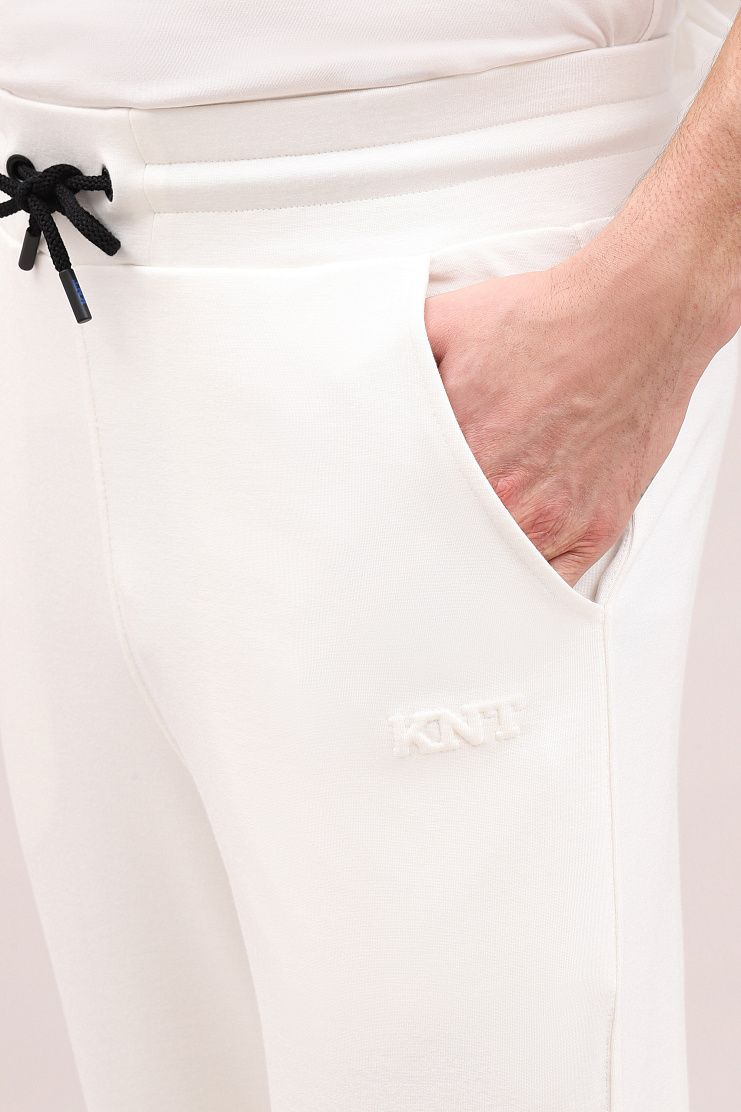 Трикотажные брюки с тиснением в виде логотипа KNT и акцентным шнурком отлично подойдут для активного отдыха. Модель слегка зауженного кроя имеет эластичный пояс на кулиске и боковые карманы.