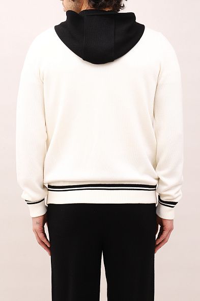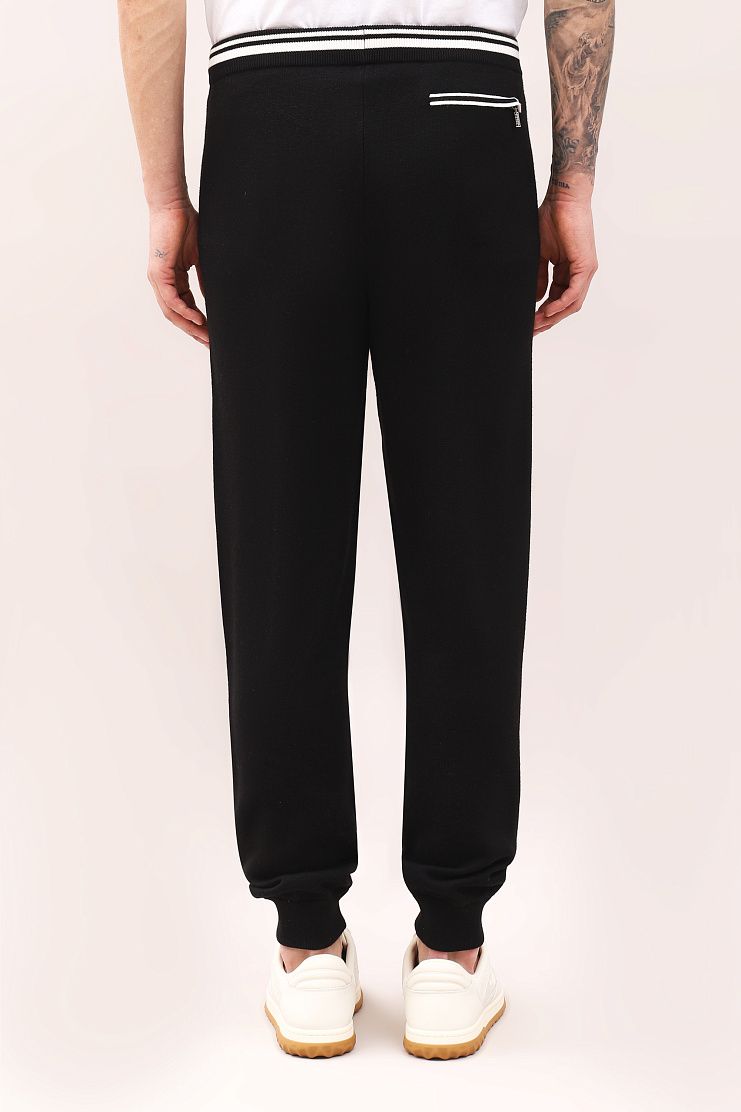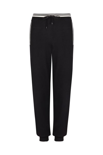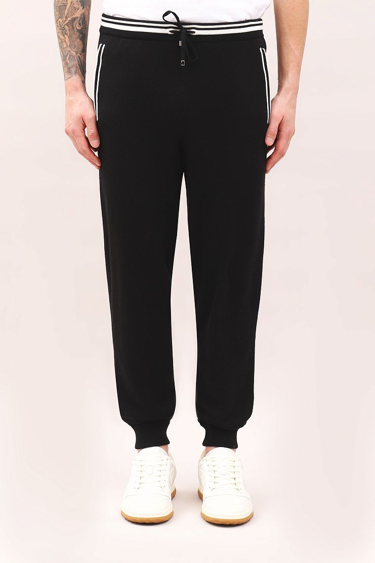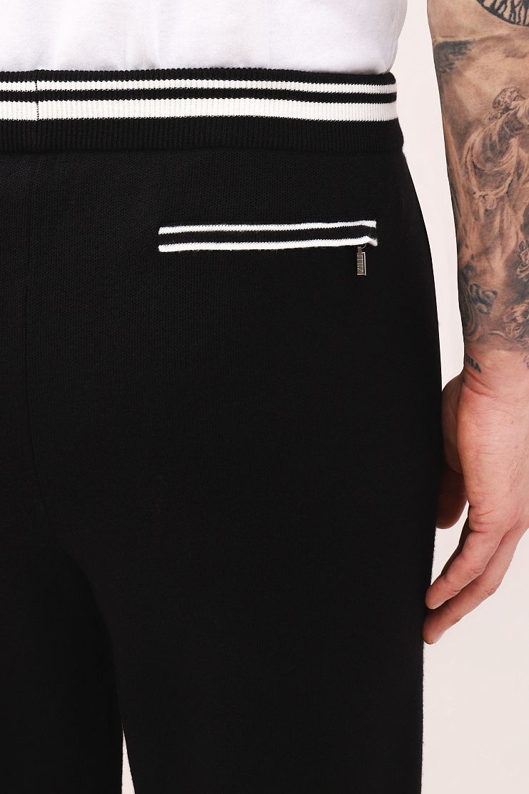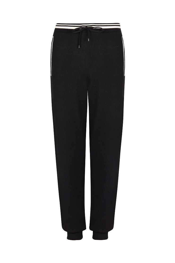 Брюки с белыми полосками на поясе и по линии карманов прекрасно подойдут для активного отдыха и занятий спортом. Модель свободного кроя имеет манжеты на штанинах, эластичный пояс на кулиске и боковые карманы.