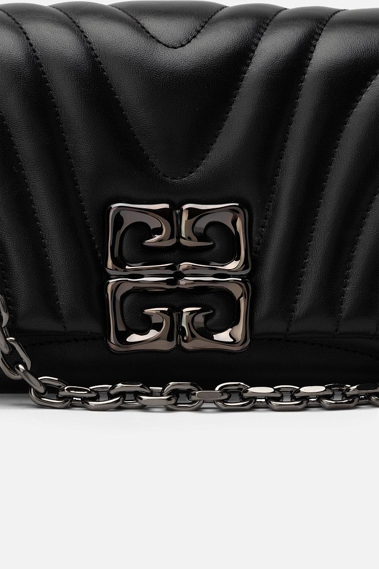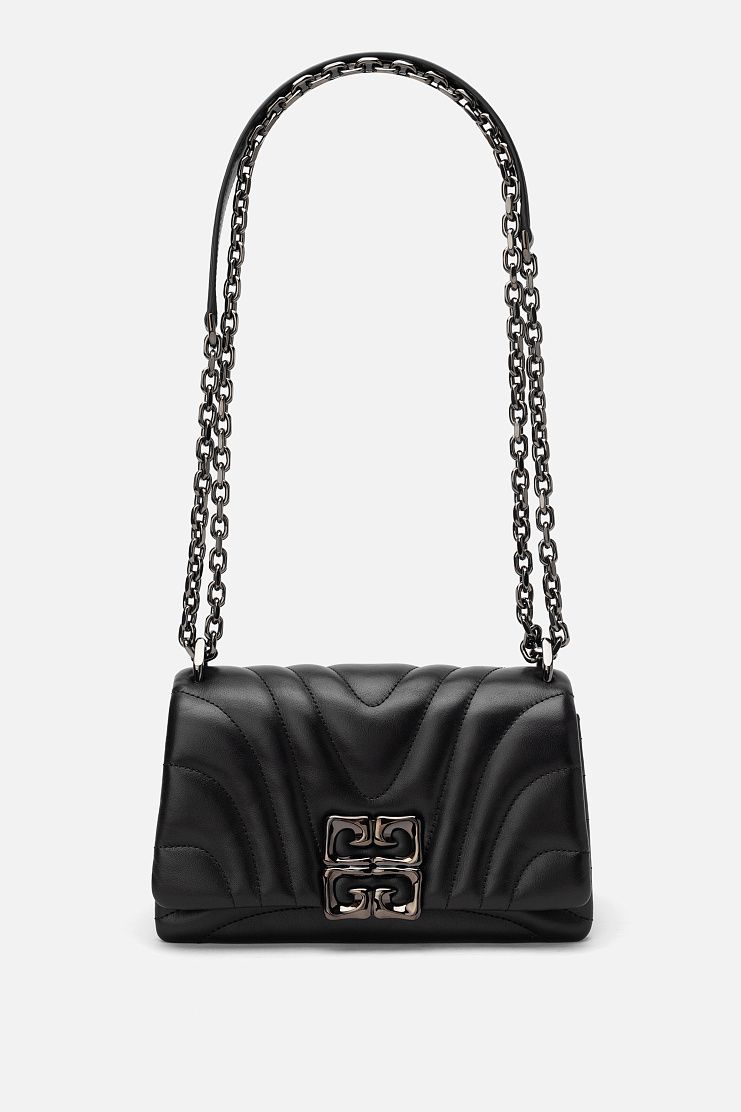 Миниатюрную стеганую сумку сшили из матовой телячьей кожи. Модель дополнена короткой ручкой и ремешком-цепочкой, а также отделением для карт внутри и плоским карманом сзади. Аксессуар застегивается клапаном с фигурной магнитной застежкой 4G.