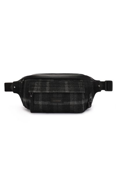 При пошиве поясной сумки скомбинировали прочную зернистую кожу и плотную шерсть с клетчатым узором. Модель с регулируемым по длине ремнем застегивается на молнию. Вместительный аксессуар дополнен сетчатой вставкой на задней панели и двумя карманами.