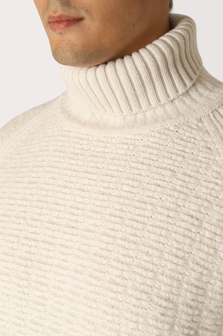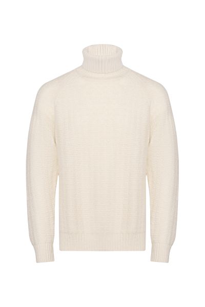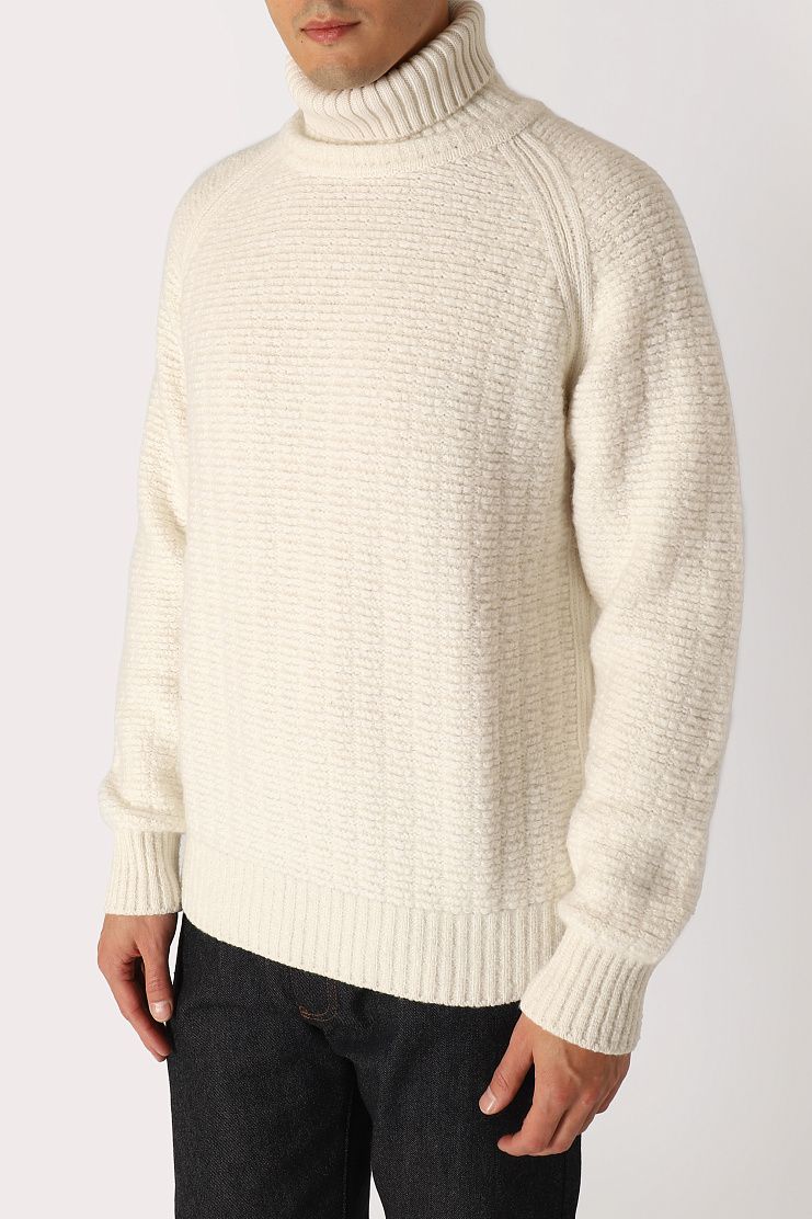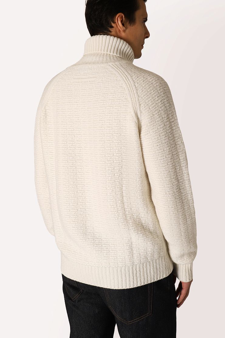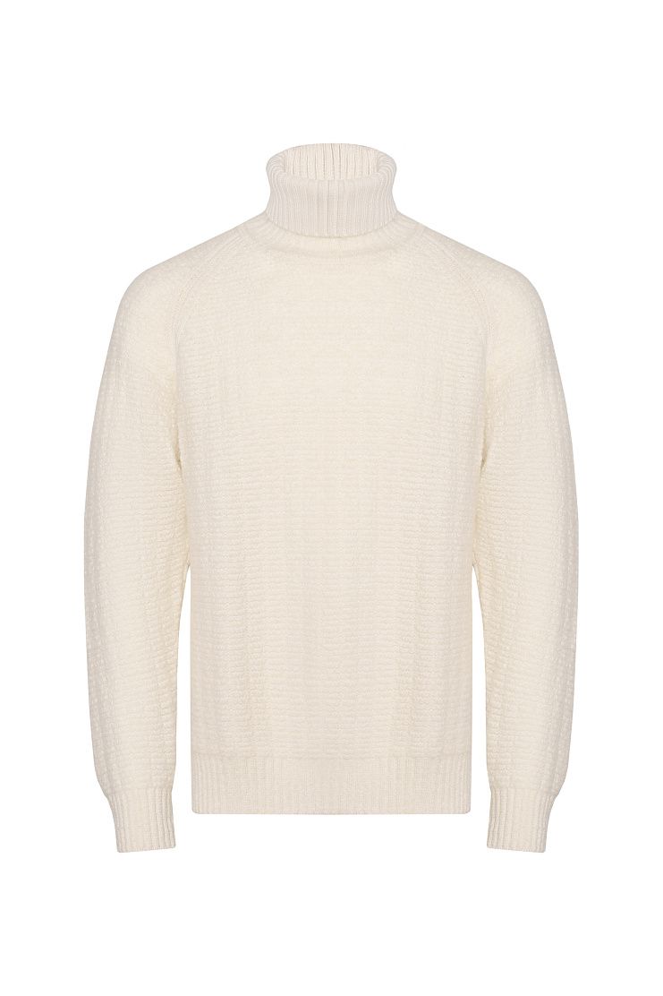 Свитер с фактурным вязаным узором выполнили из мягкой кашемировой пряжи с добавлением шелка. Модель с высоким воротником и рукавами реглан дополнена эластичной отделкой в рубчик на манжетах и поясе.