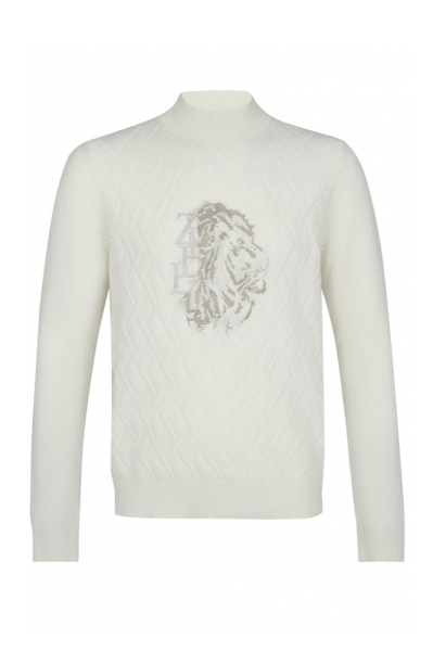 Кашемировый свитер с передней частью фактурной вязки, украшенный вышивкой в виде головы льва и надписи Zilli на груди. Модель свободного кроя с воротником-стойкой.