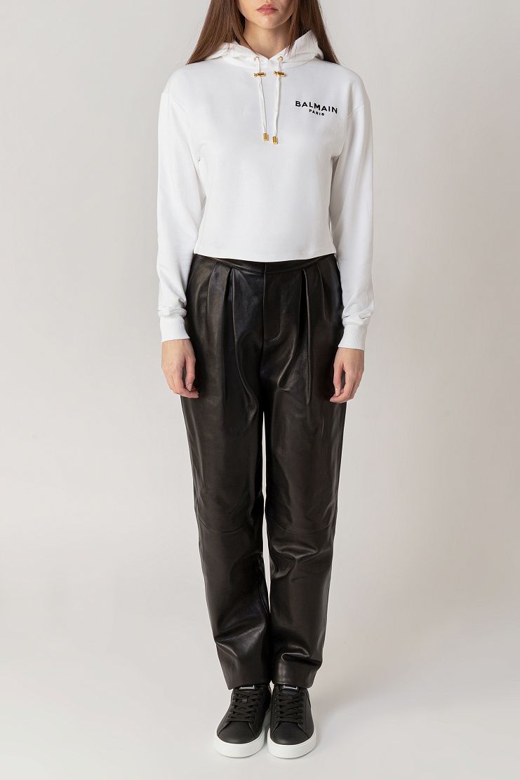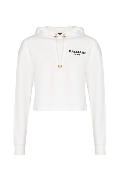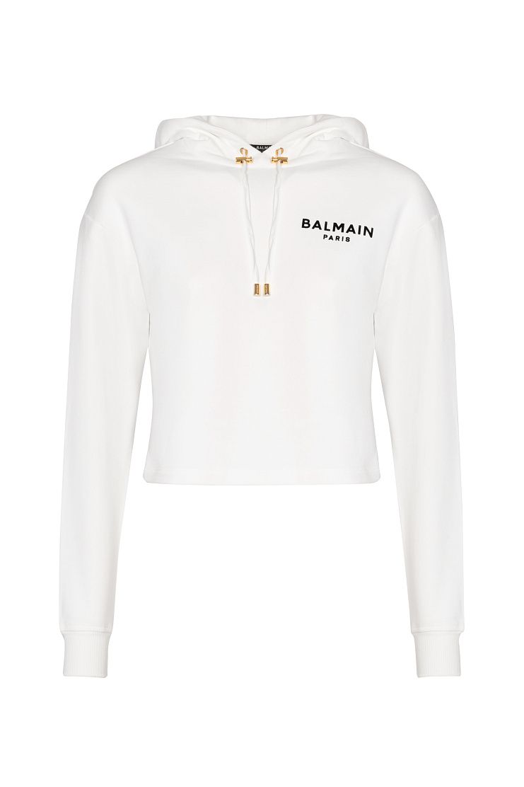 Укороченная толстовка свободного кроя выполнена из мягкого хлопка. Модель дополняют капюшон на кулиске со стопперами, карман-кенгуру, а также рукава со спущенной линией плеч. Ребристая отделка на рукавах и по низу подчеркивает спортивный стиль, а логотип Balmain на груди создает фирменный акцент.